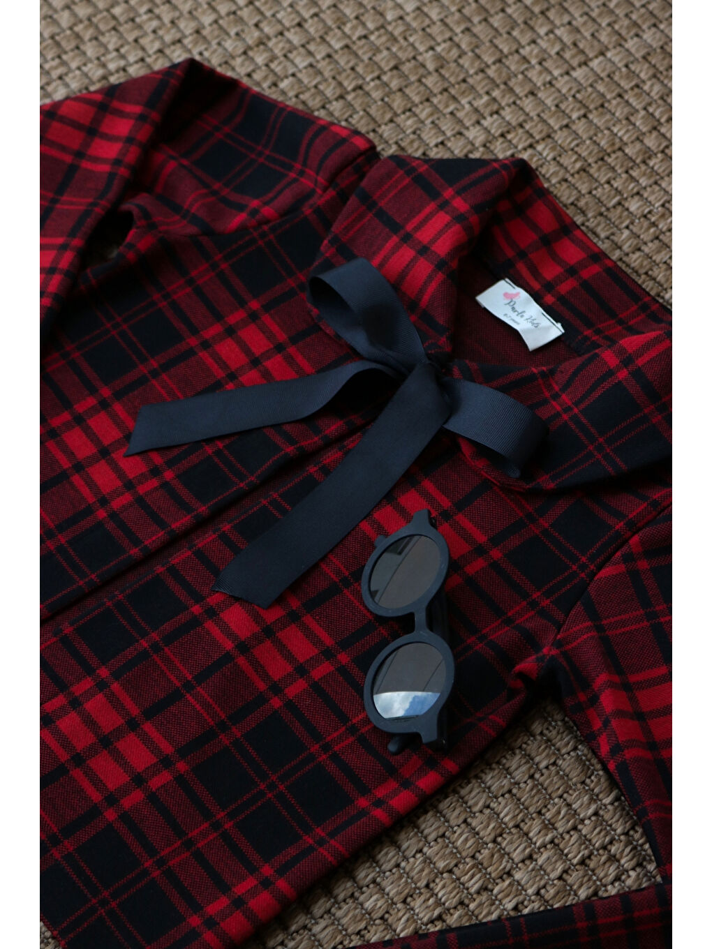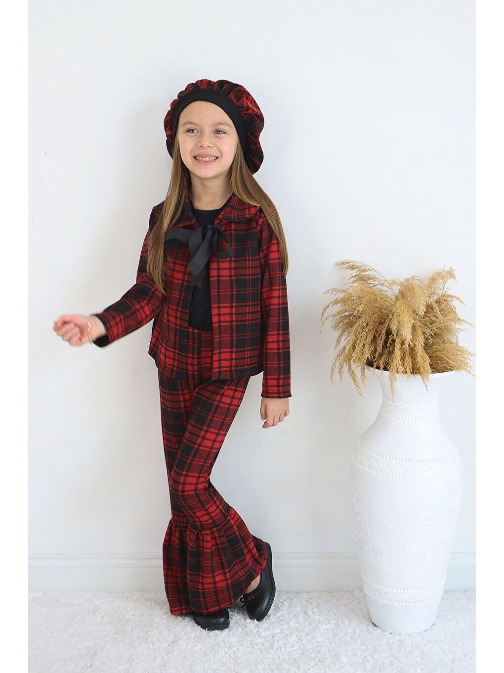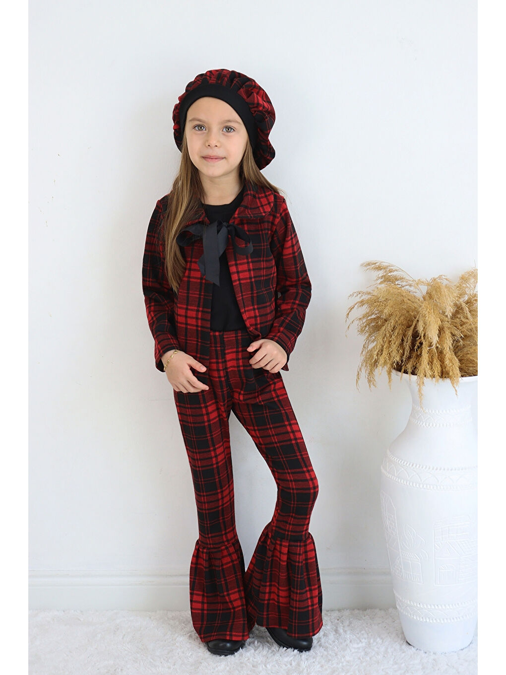 ست کت، شلوار، کلاه، پایین تنه و تاپ چهارخانه ژاکارد لیسبون قرمز دخترانه، مناسب برای عید نوروز