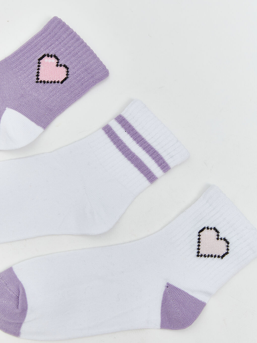 جوراب‌های دخترانه‌ی سه‌تایی از پارچه‌ی ترکیبی پنبه‌ای انعطاف‌پذیر ساخته شده‌اند و طرح قلب دارند.