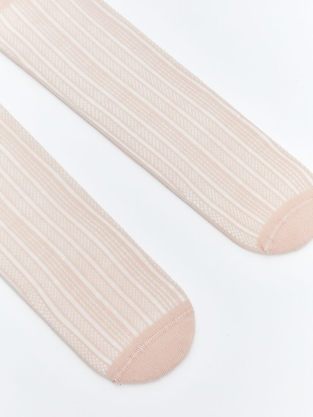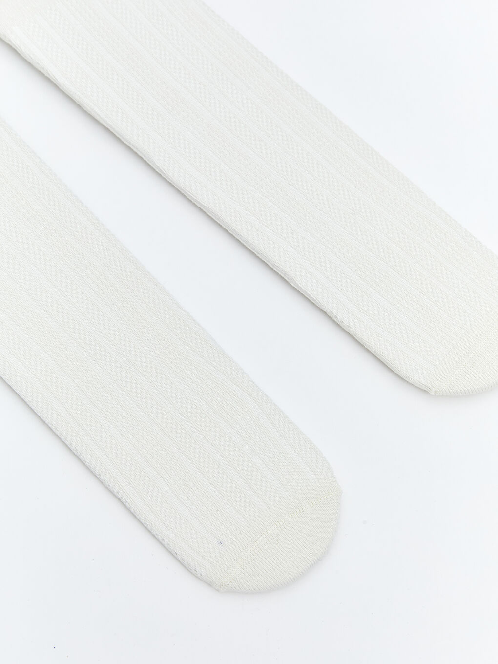 جوراب شلواری نوزادی دخترانه با رویه ساده و بافت عمودی شیاردار در قسمت پا، دارای کمر کشی است.