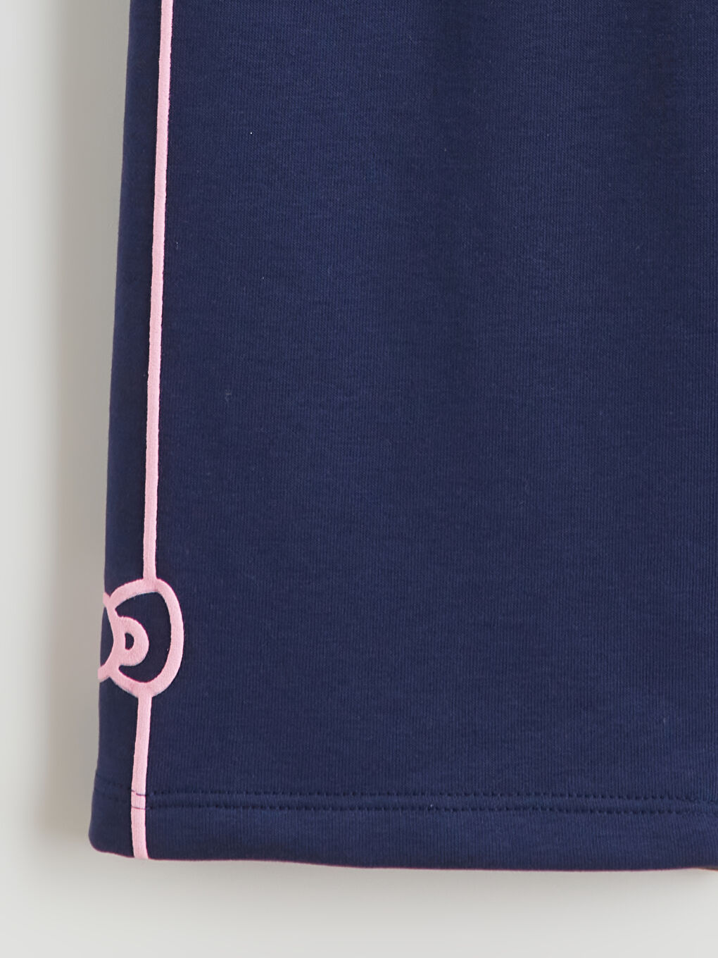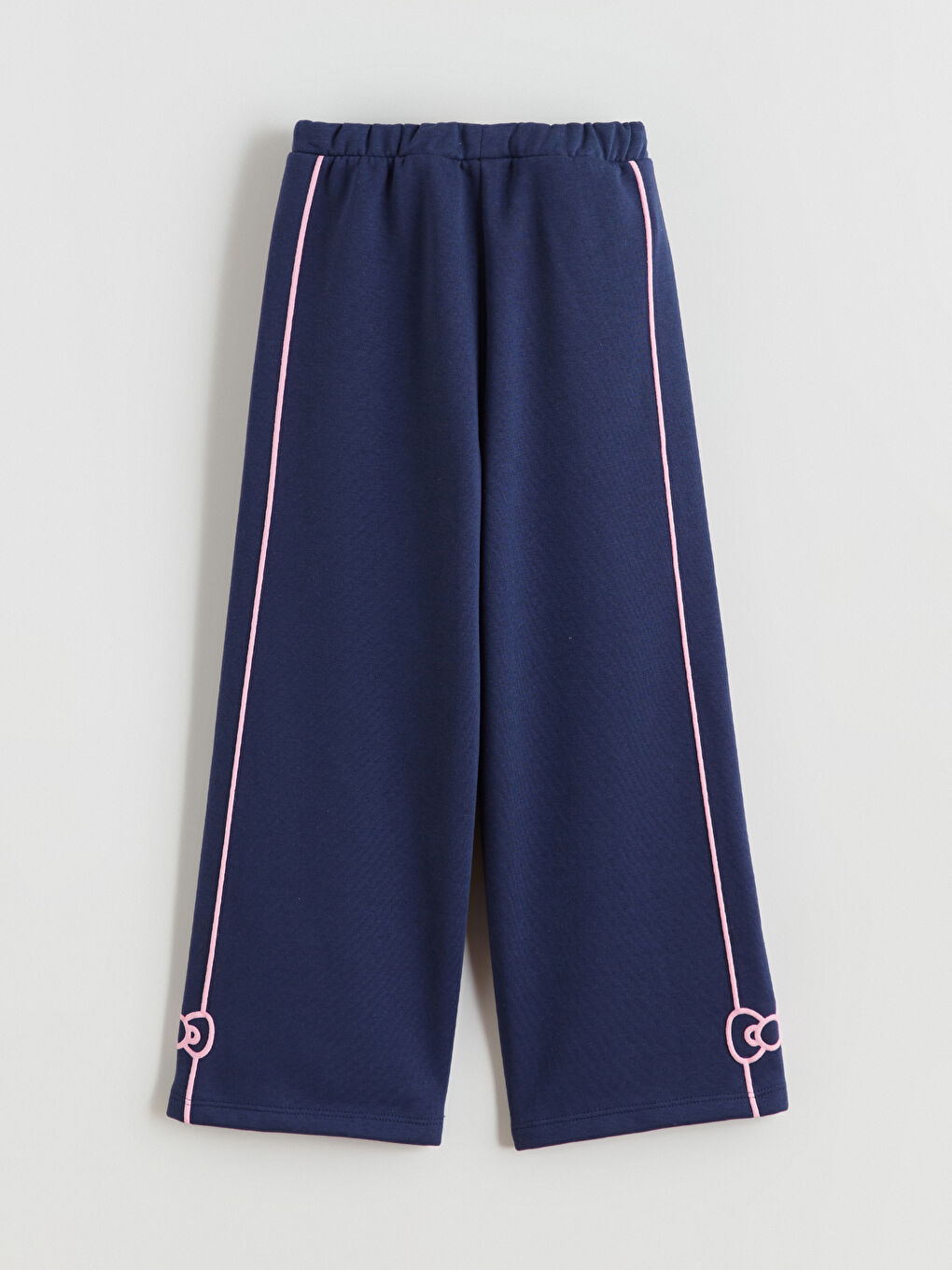 شلوار ورزشی دخترانه دمپا گشاد دارای کمر کشی، نوارهای کناری و لبه گلدوزی شده است.