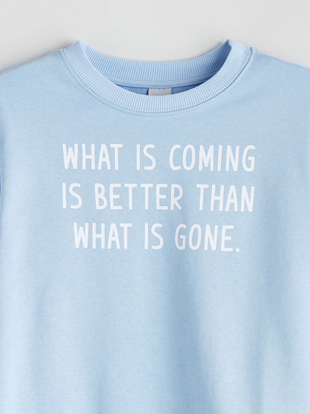 سویشرت دخترانه یقه گرد، آستین بلند با چاپ متن در جلو. سر آستینها و لبهی آن کشباف است.