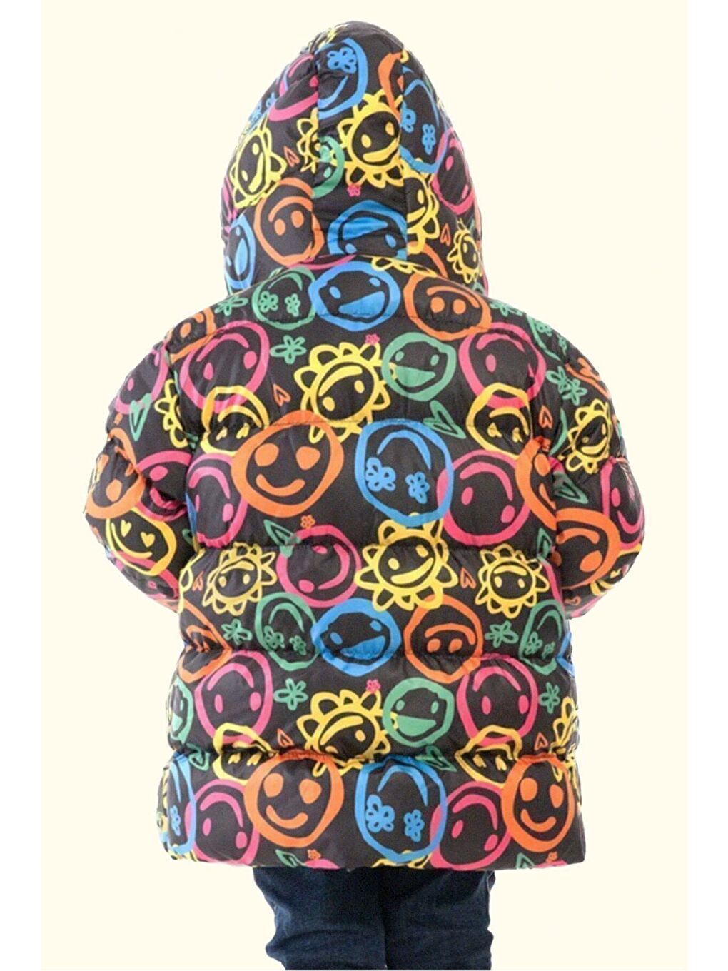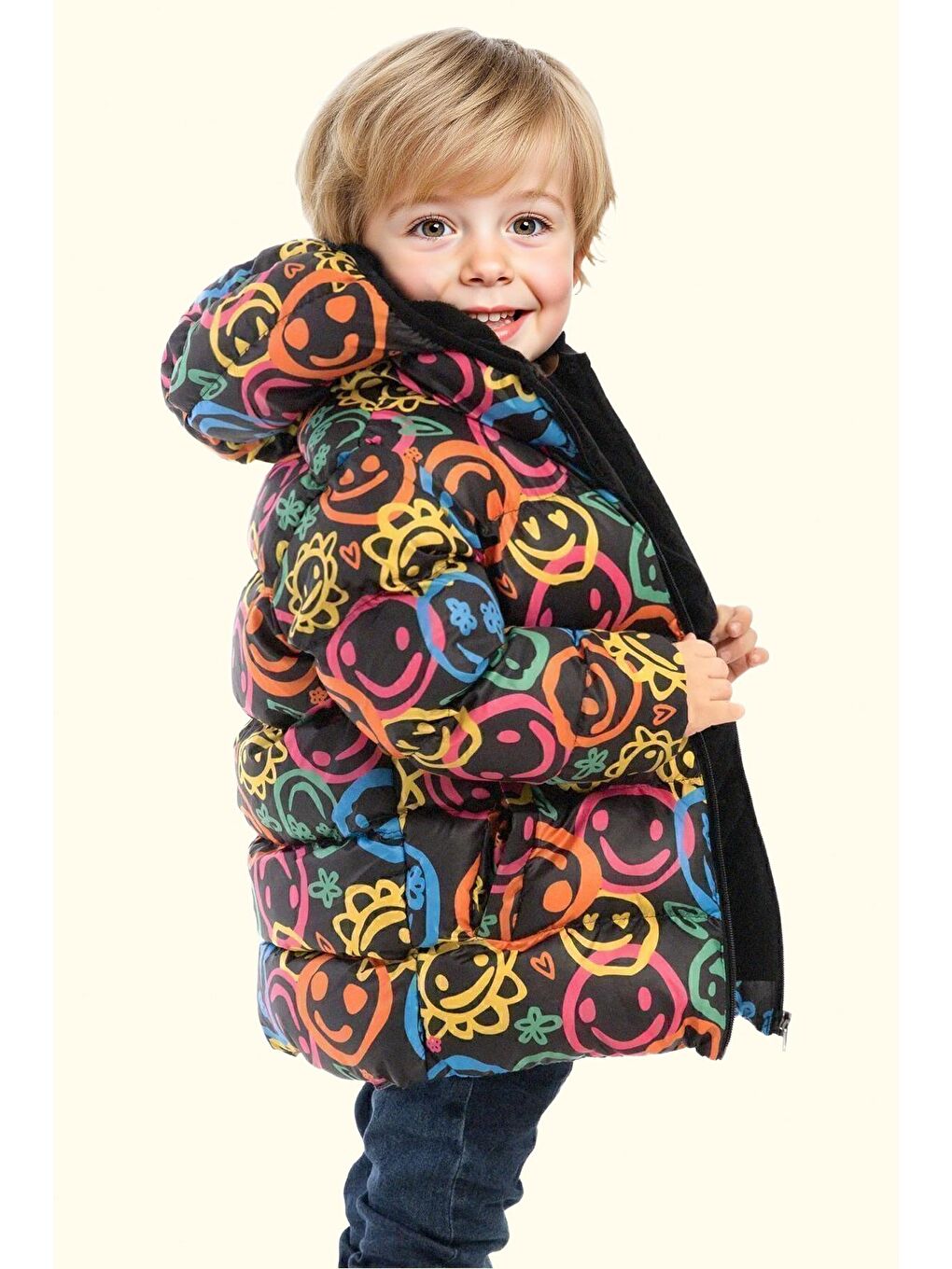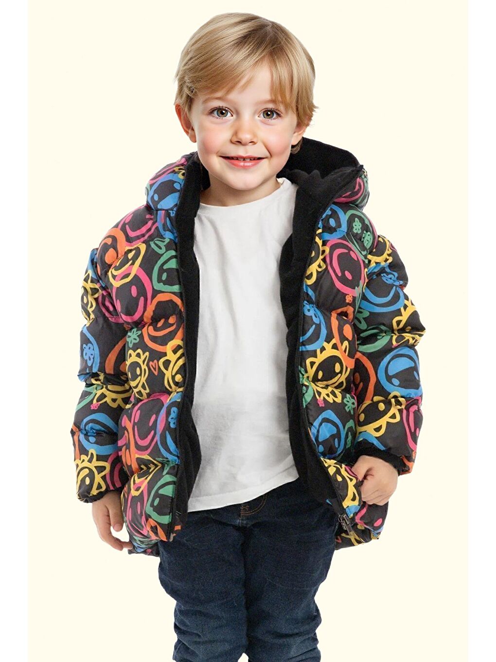 پالتو پفی زمستانی کلاه دار ضد آب و باد پسرانه طرح اسمایلی ایموجی پشمی