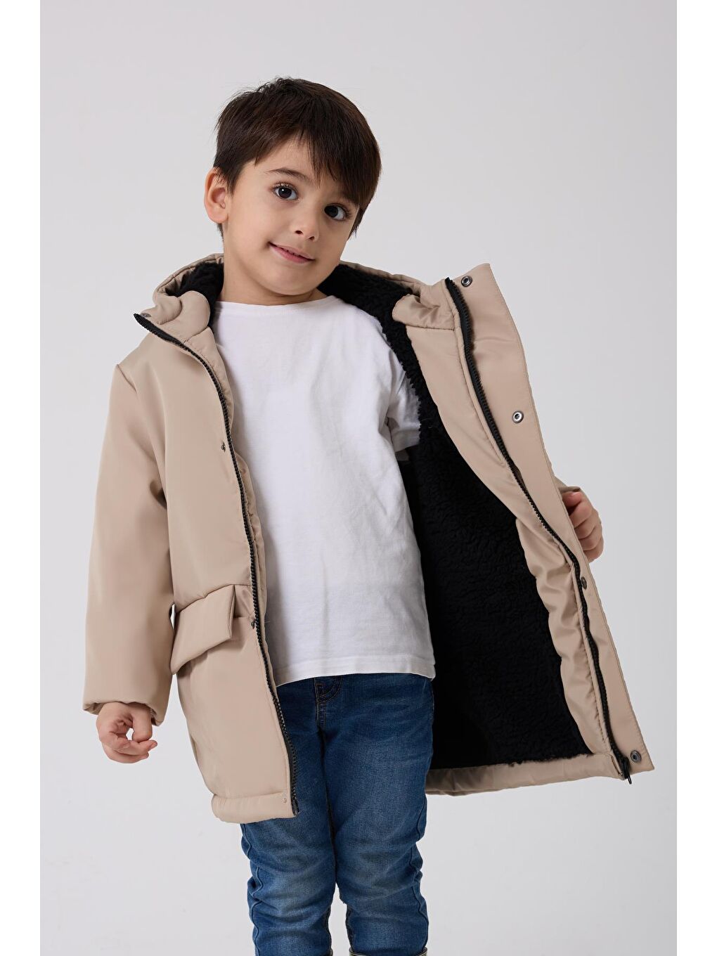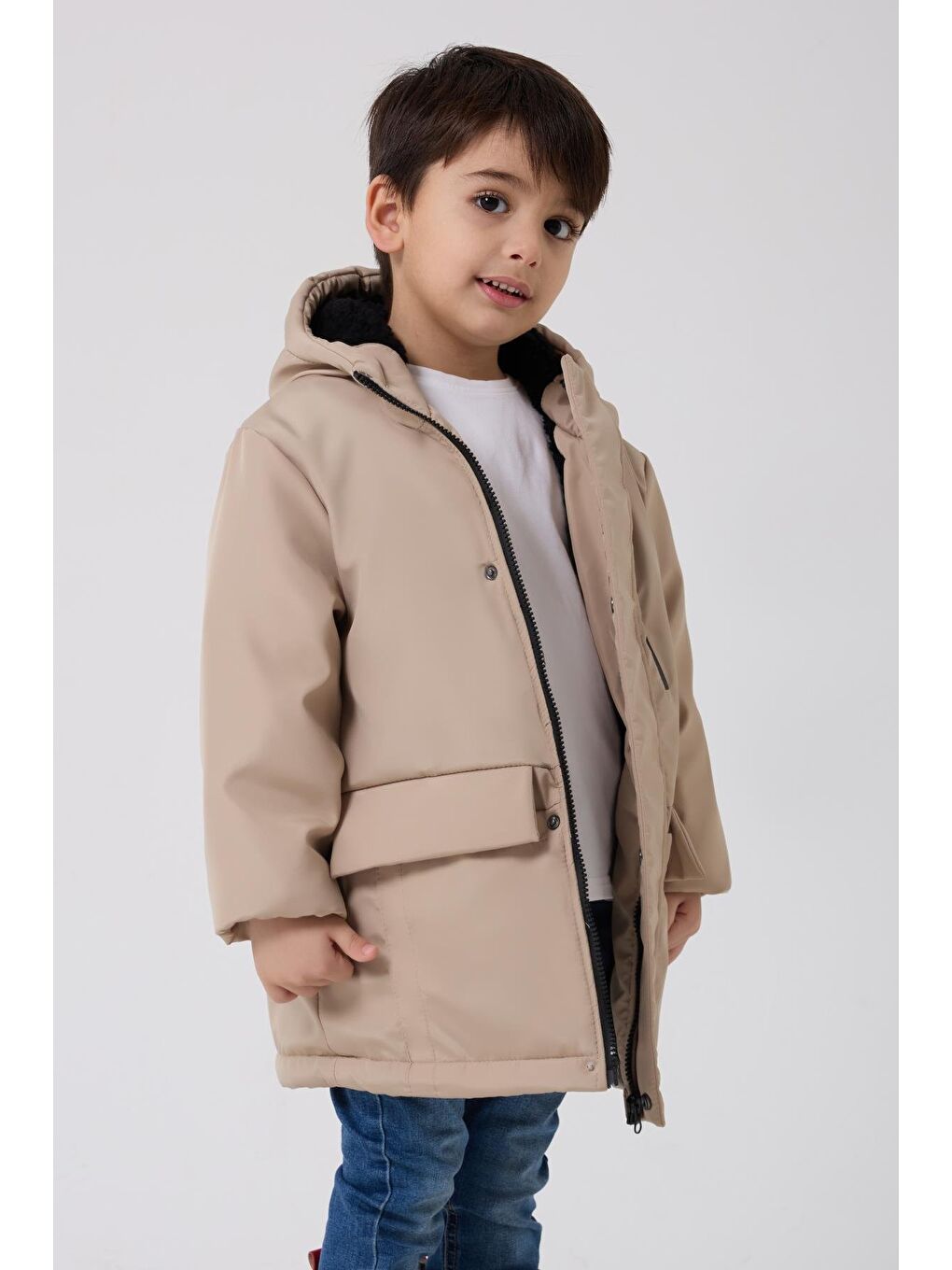 ۳ کت و کاپشن زمستانی کلاه‌دار خزدار پسرانه بژ ضد آب و باد