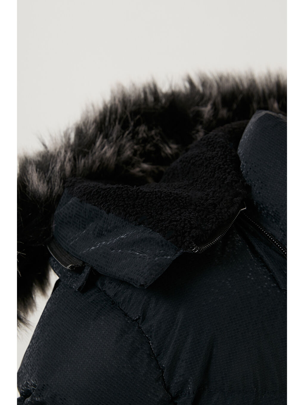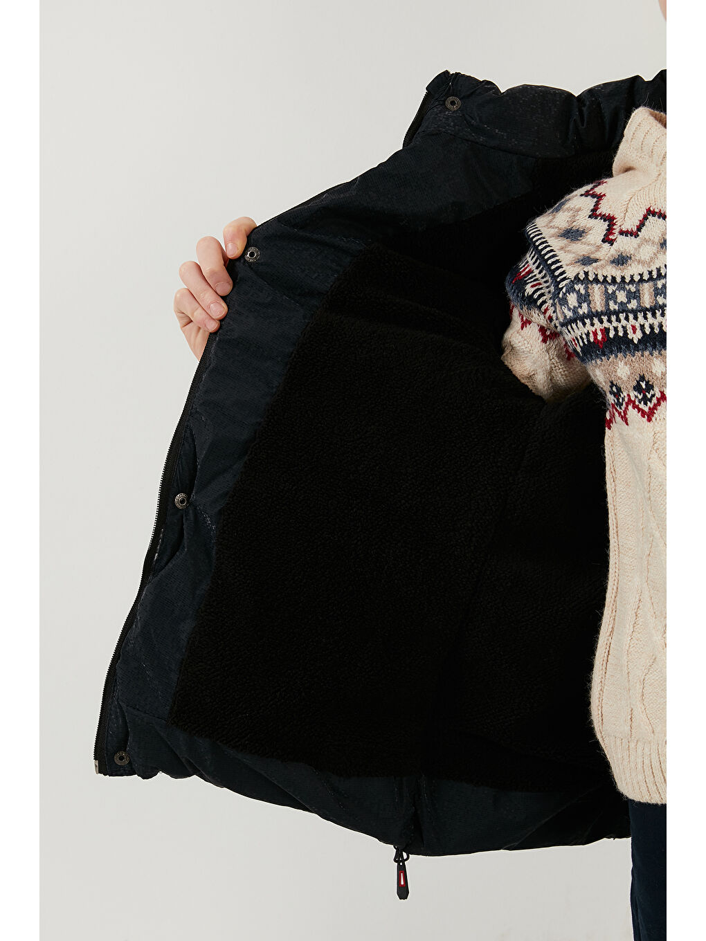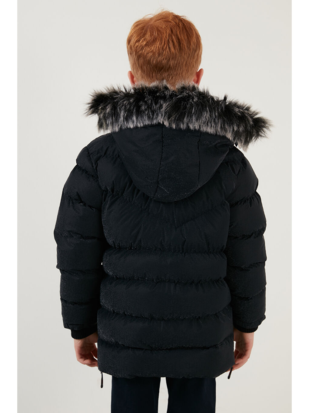 پالتو زمستانی پسرانه کلاه دار یقه جداشدنی با آستر مخمل آبی سرمه‌ای، کد ۵۷۶۱۹۰۶