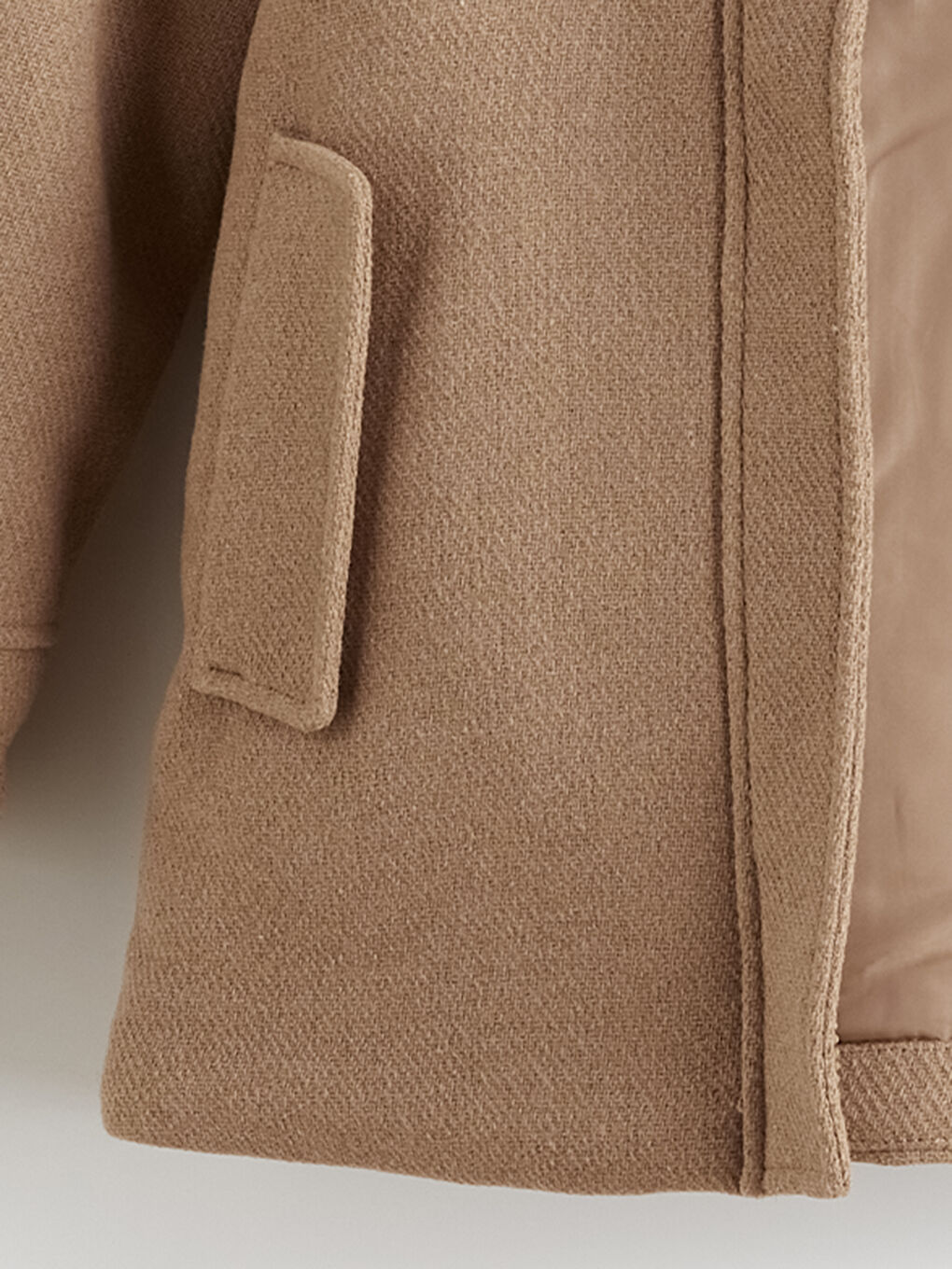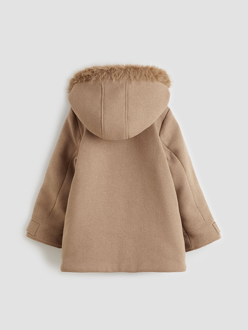 این پالتوی دخترانه که از پارچه کشمیر ساخته شده، دارای کلاهی ثابت و خزدار است. این پالتو از جلو با قلاب دوتایی بسته میشود و دارای جیبهای وصلهای است.
