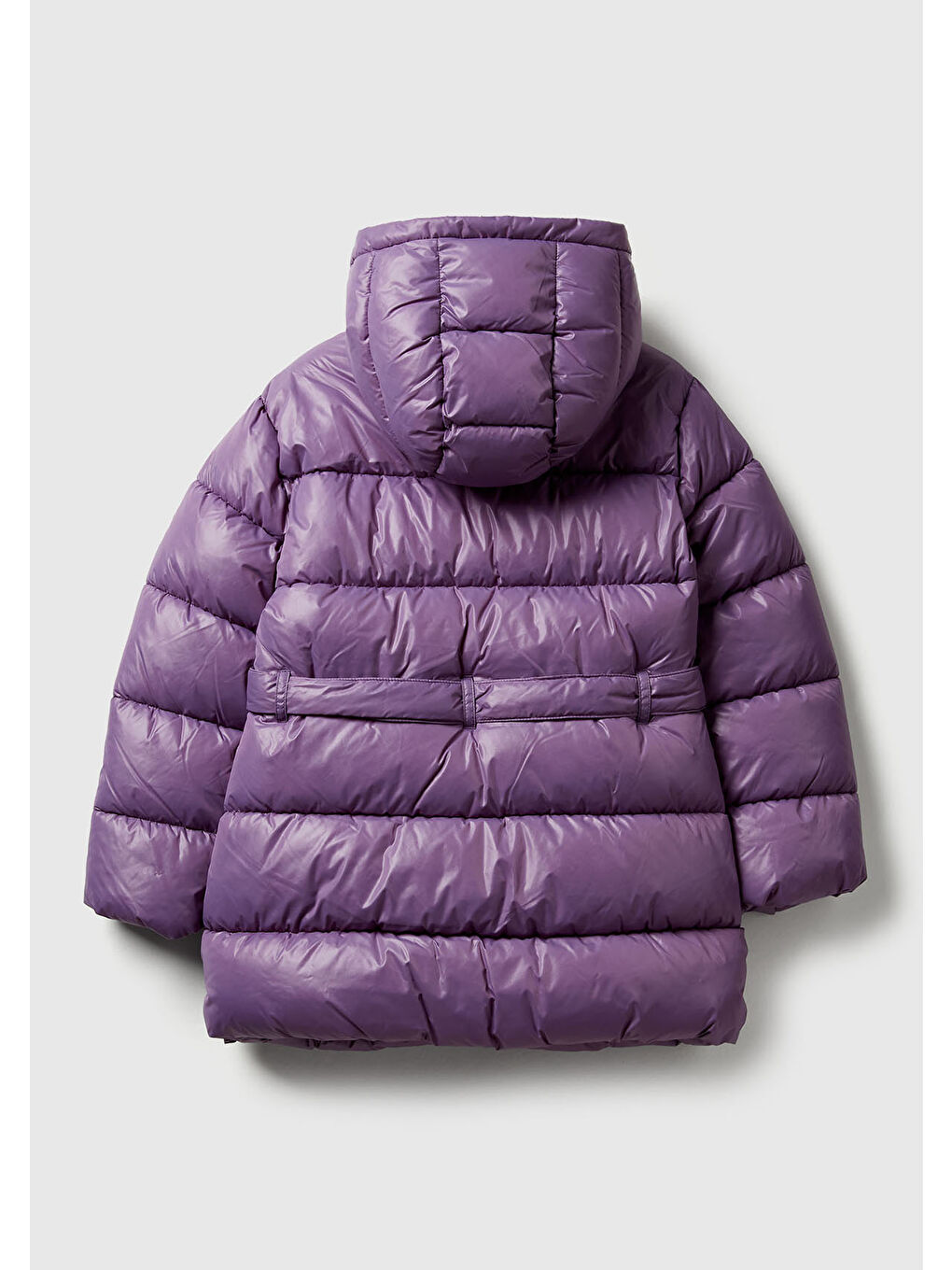 پالتو دخترانه بنفش طرح دار با آستین های براق و لوگو، کلاه دار کمر گره ای