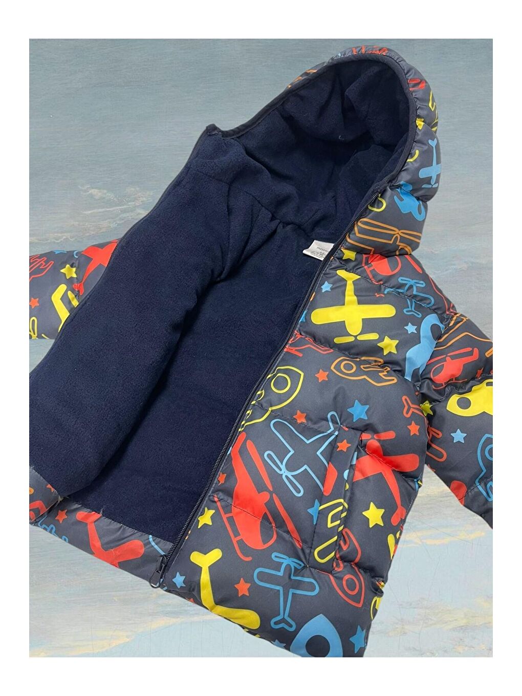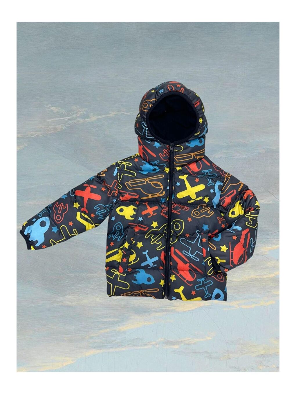 کاپشن و پالتو و پارکا زمستانی پفی طرح هلیکوپتر کلاه دار دخترانه مشکی از جنس پشم قطبی