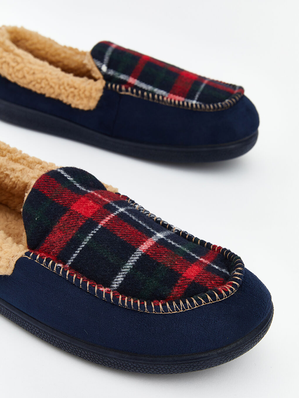 دمپاییهای راحتی مردانه با طرح چهارخانه و آستر مخمل. دارای دوخت تزئینی در قسمت رویه.
