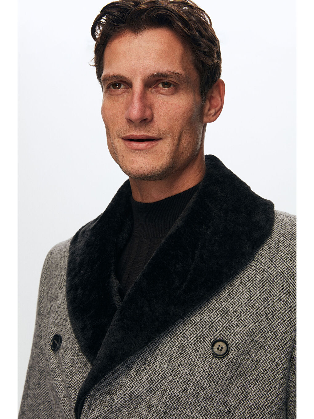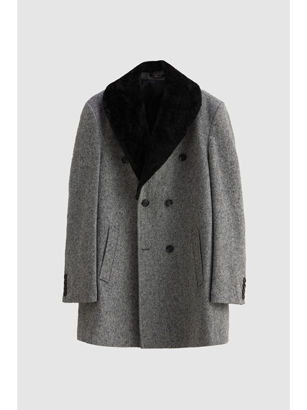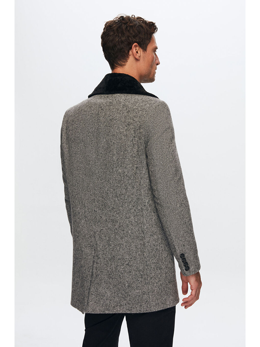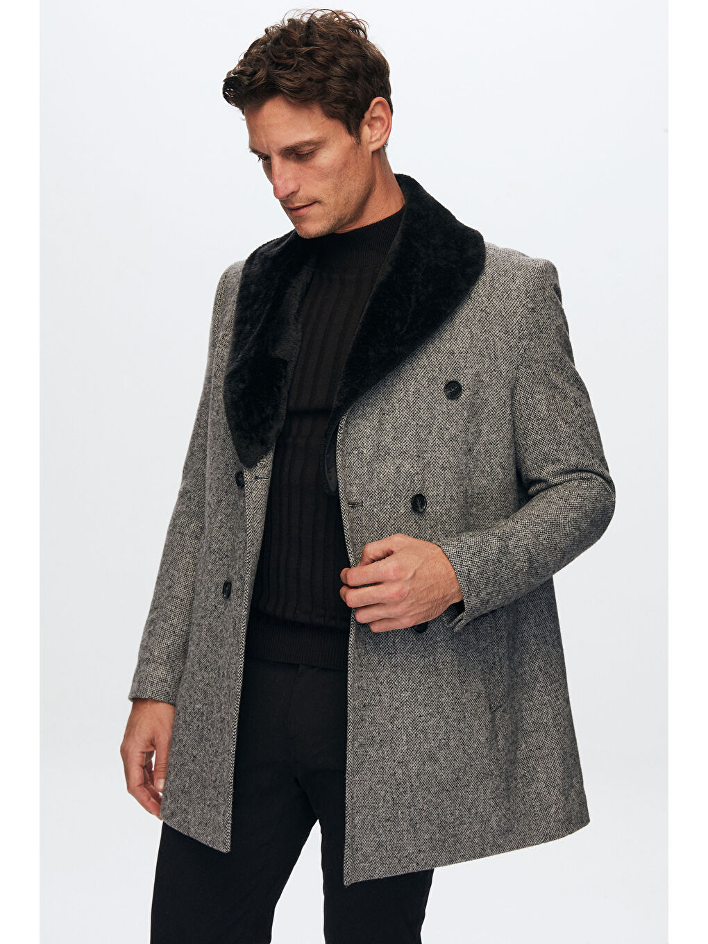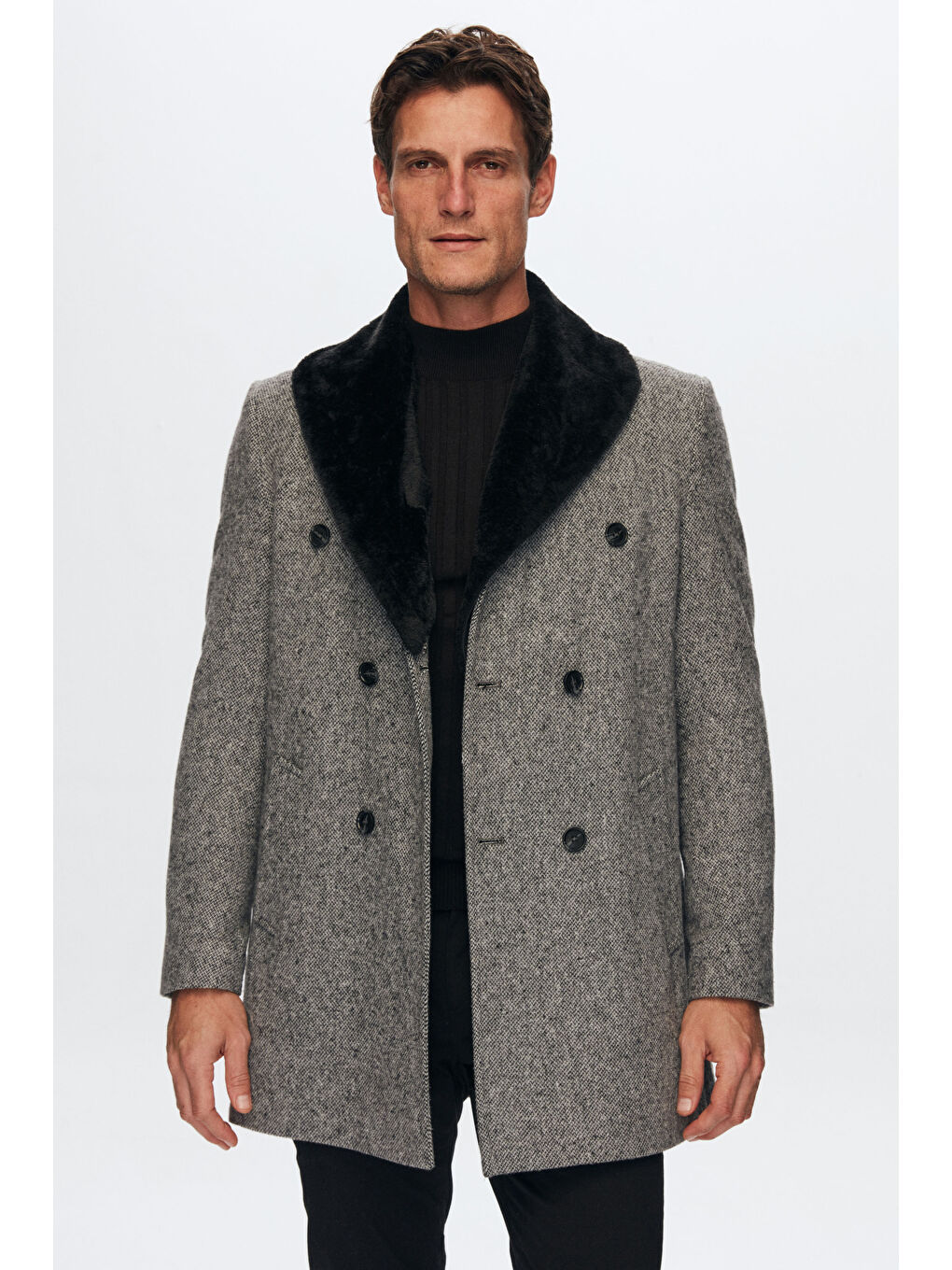 کت خاکستری دو دکمه سایز معمولی با یقه خز قابل جدا شدن