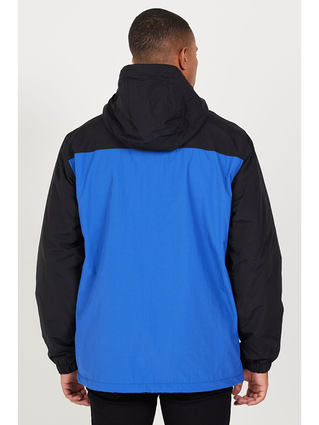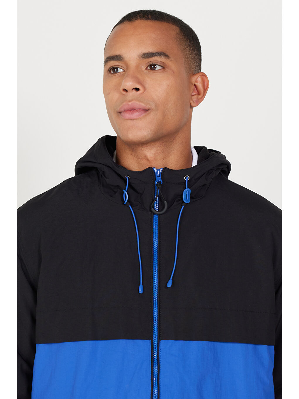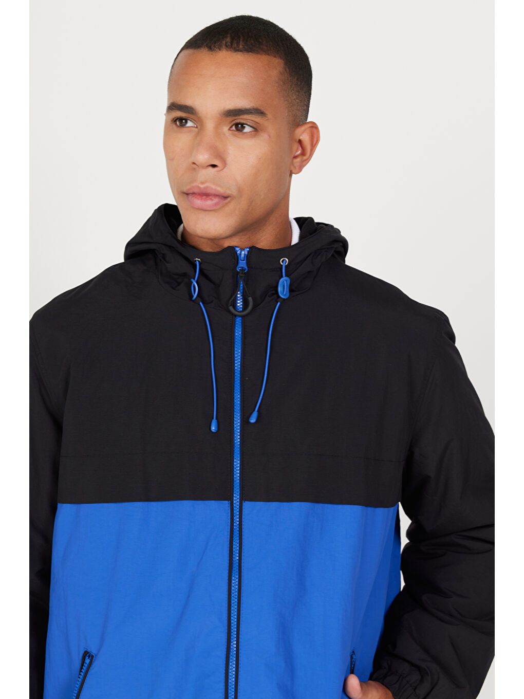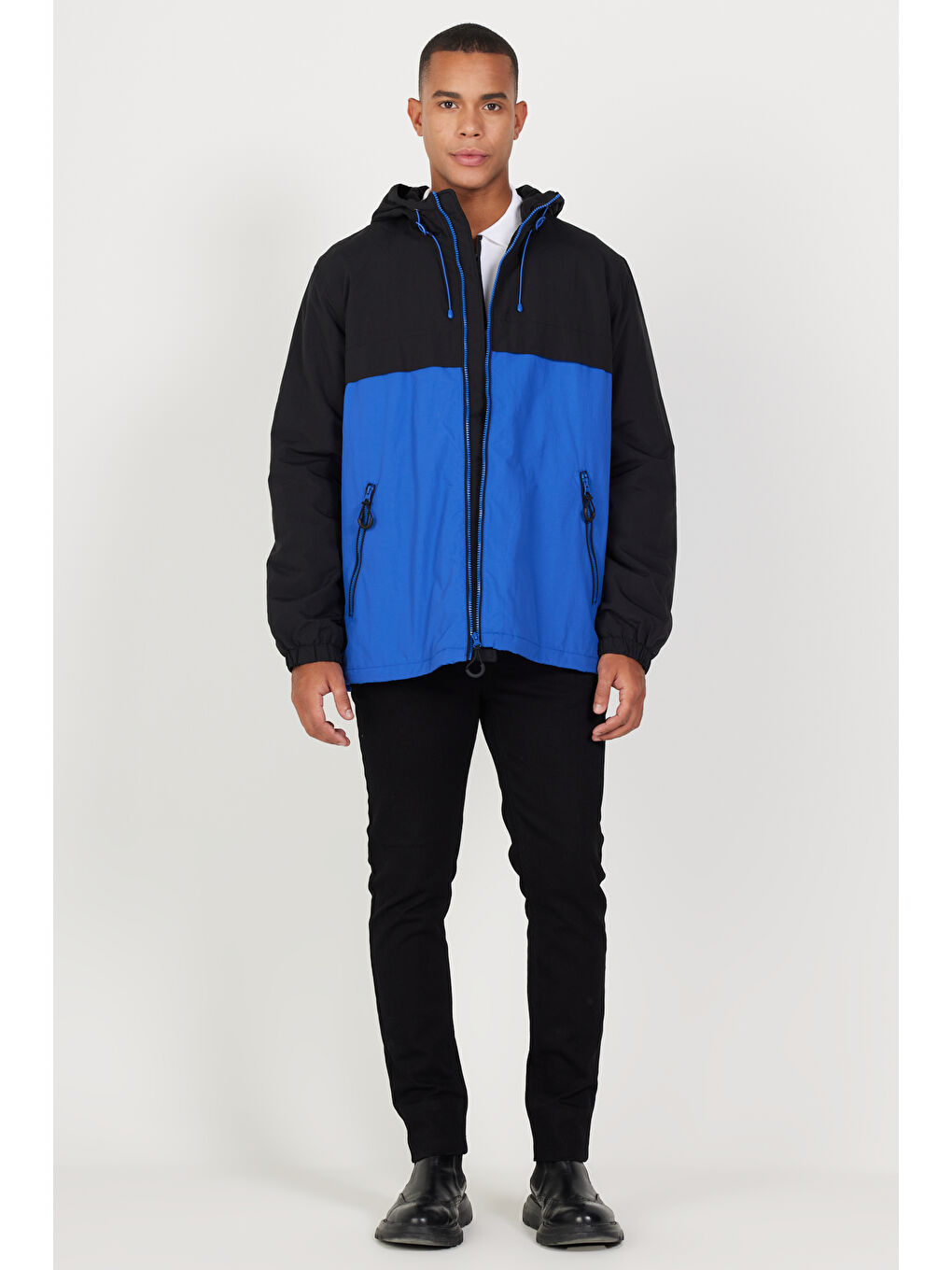 پالتو مردانه مشکی-ساکس استاندارد فیت، یقه ایستاده، برش معمولی، ضد سرما، پشم گوسفند داخل کلاه دار