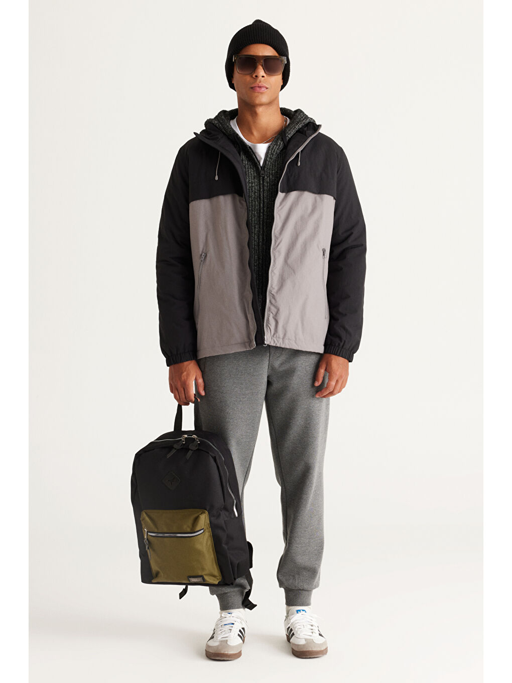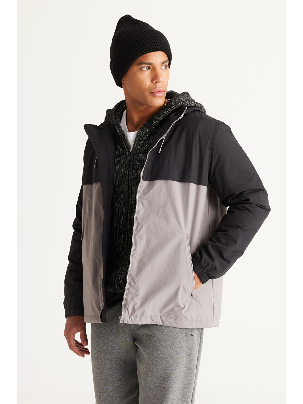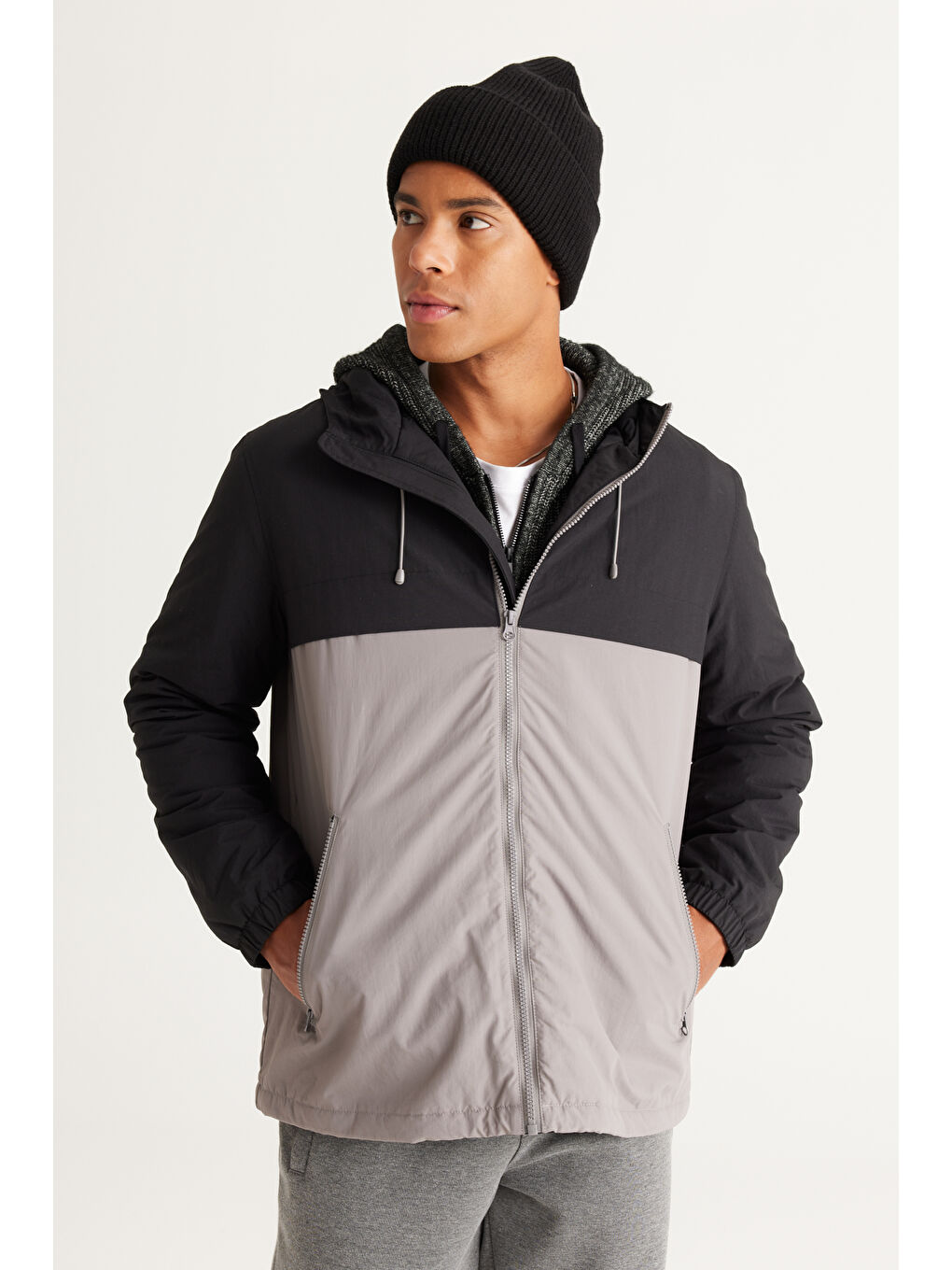پالتو مردانه کلاه دار مشکی-خاکستری، یقه ایستاده، ضد سرما، از جنس پشم، داخل، مناسب برای آقایان