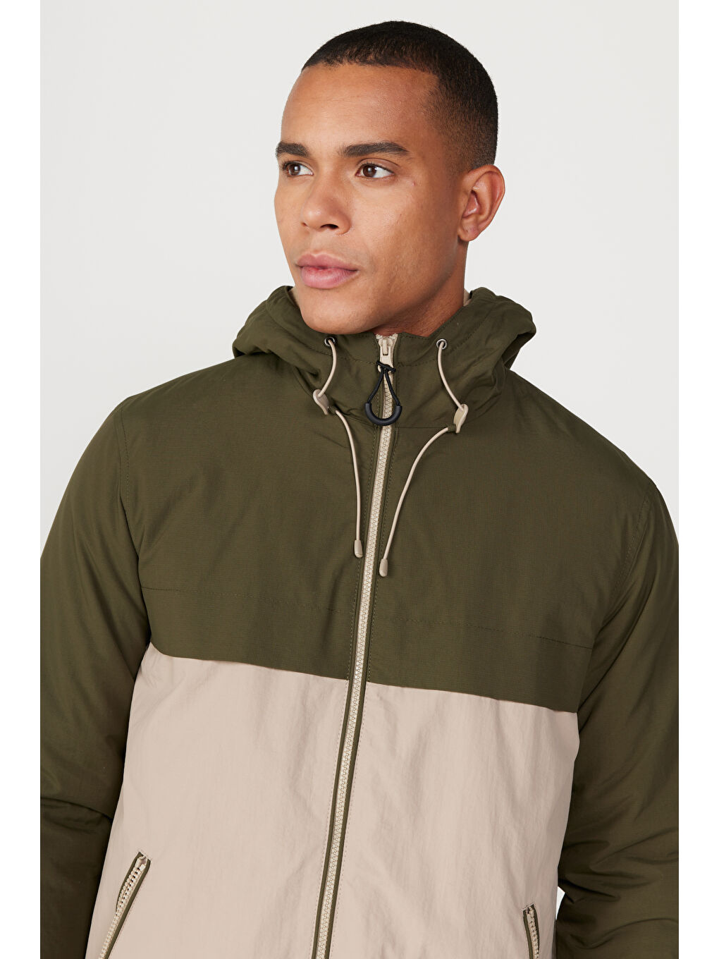 پالتو مردانه یقه ایستاده با برش معمولی، رنگ بژ-خاکی، یقه هفت، ضد سرما، داخل کلاه دار، جنس پشمی