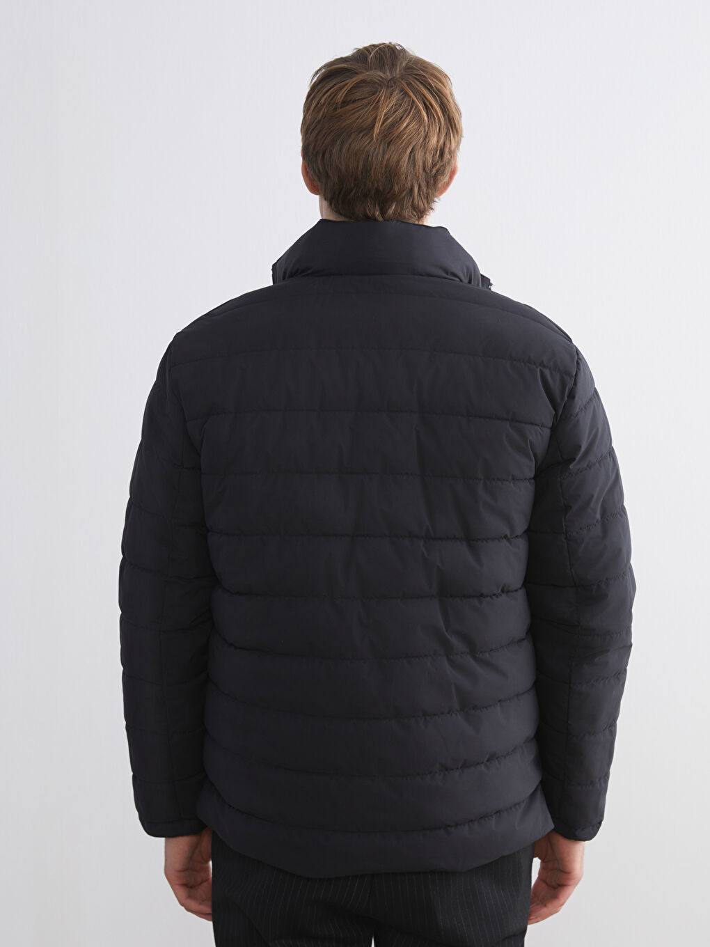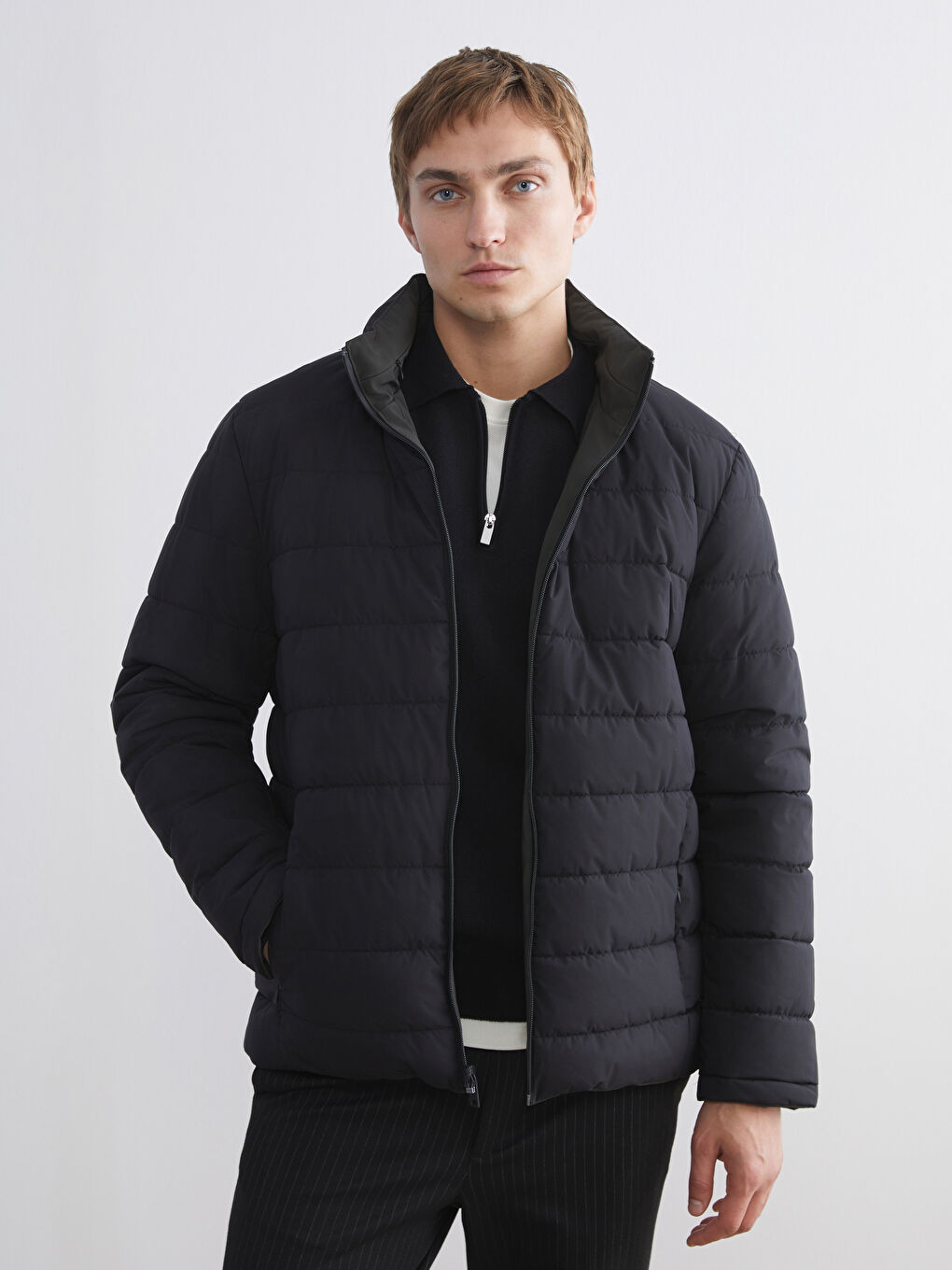 کاپشن پافر مردانه، یقه ایستاده، آستین بلند، ضخامت متوسط، دارای زیپ جلو. جیب‌های زیپ‌دار در کنار و روی سینه.