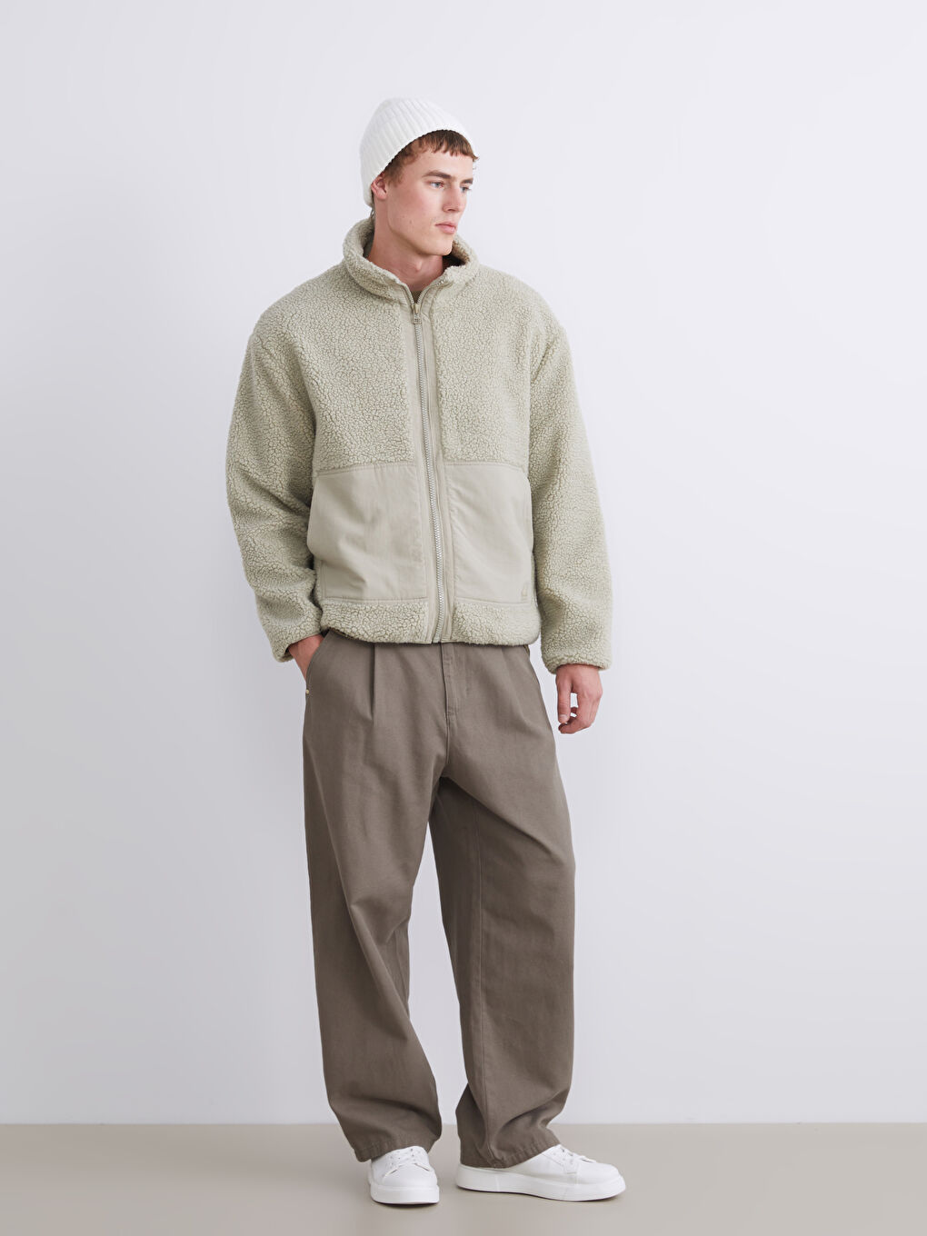 پالتو مردانه مخمل خاکی با یقه ایستاده و فیت استاندارد