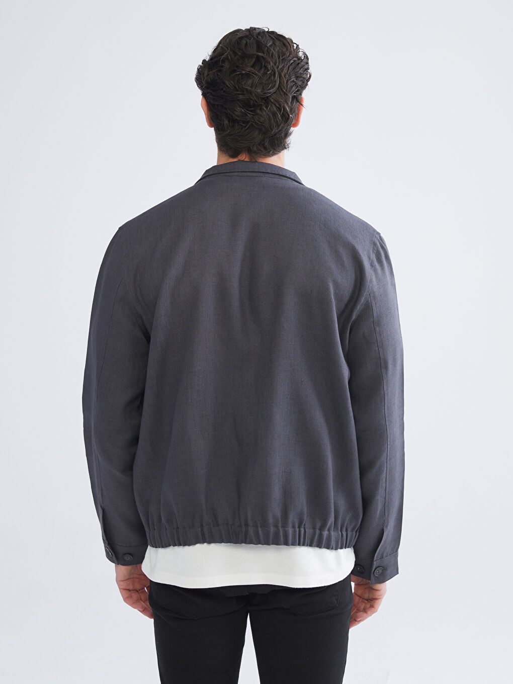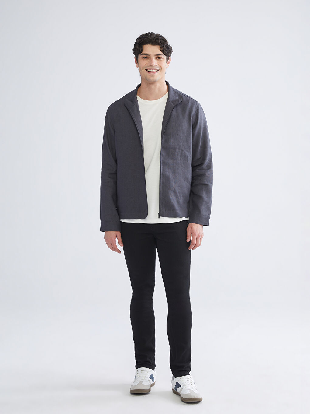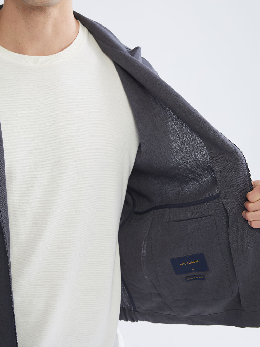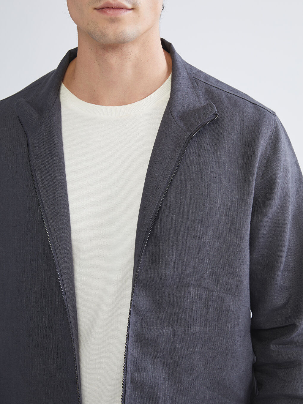 این کاپشن مردانه از جنس کتان ساخته شده و دارای یقه ایستاده، آستین بلند، زیپ جلو و جیبهای کناری است.