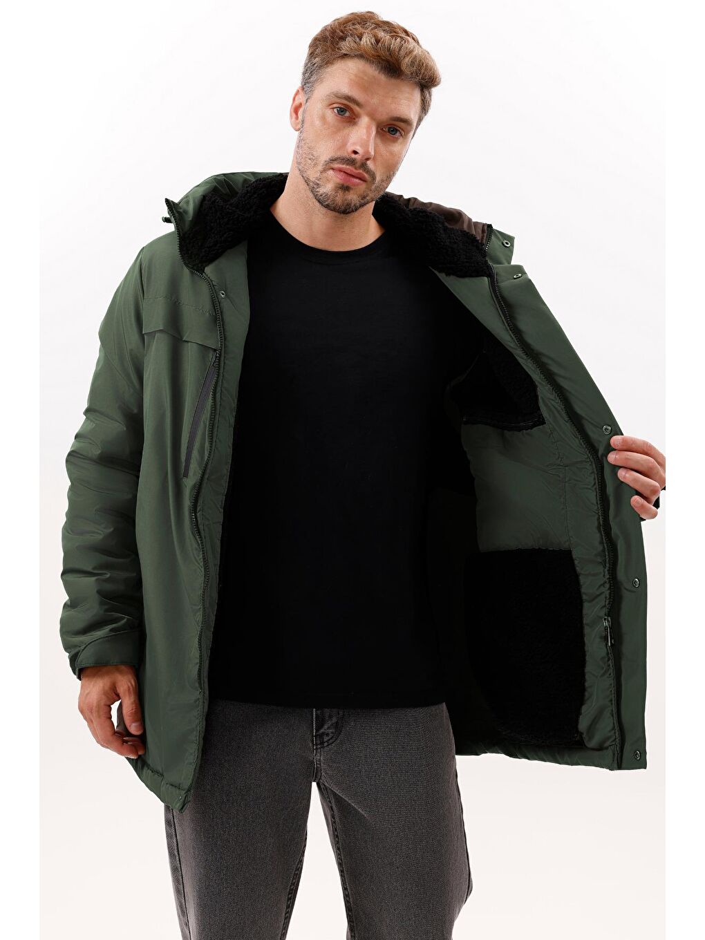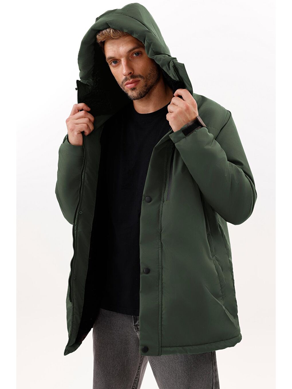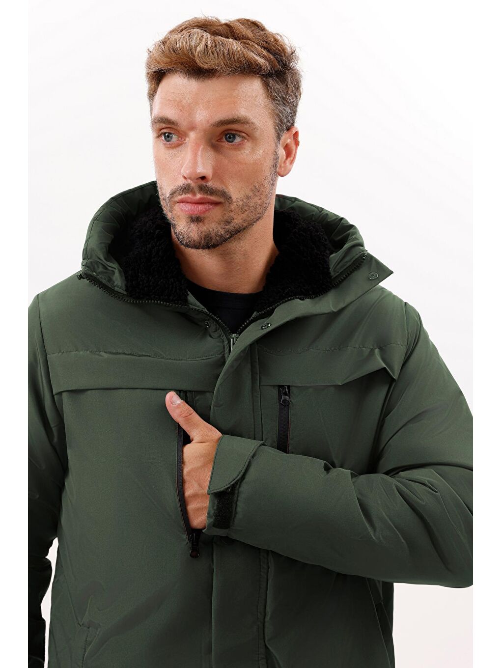 پالتو و پارکا زمستانی کلاهدار مردانه خاکی خزدار ضد آب و باد – آستر الیافی