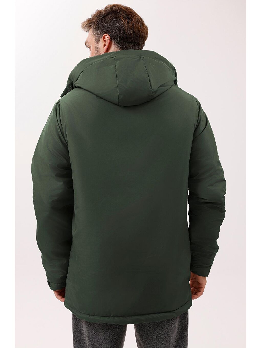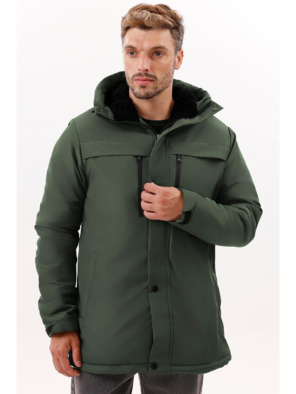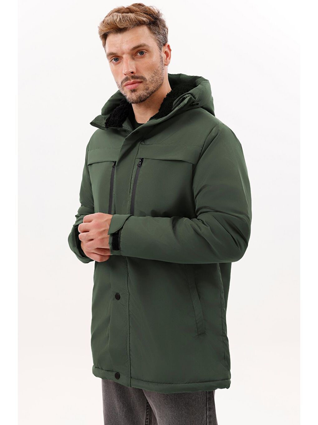 پالتو و پارکا زمستانی کلاهدار مردانه خاکی خزدار ضد آب و باد – آستر الیافی