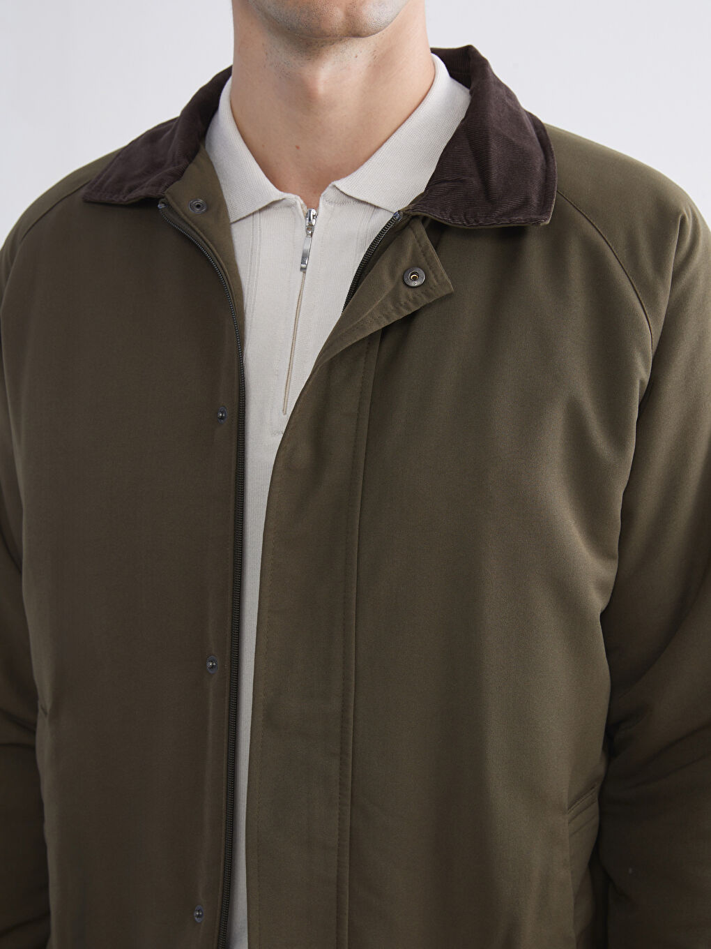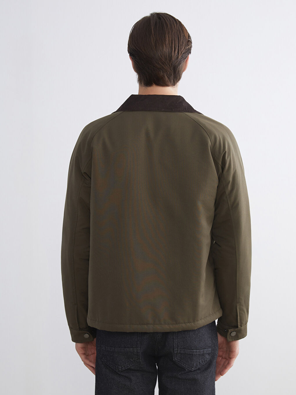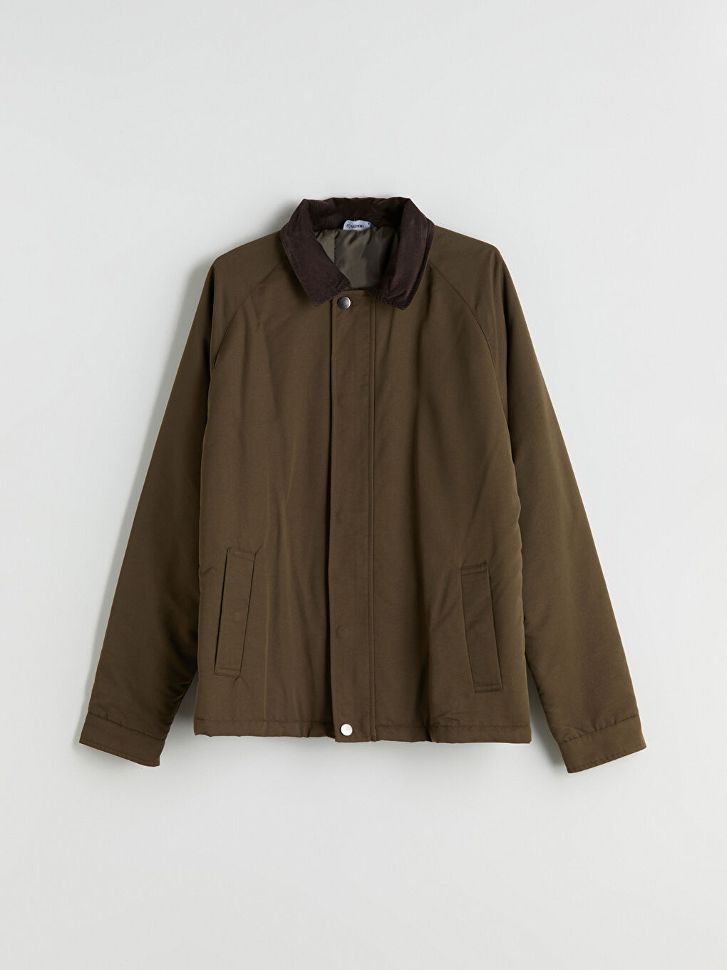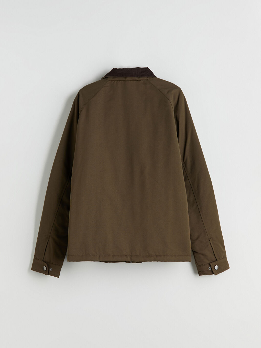 یک کاپشن مردانه با یقه کلاسیک و آستین بلند رگلان. جلو با دکمه بسته می‌شود. دو جیب در جلو دارد.