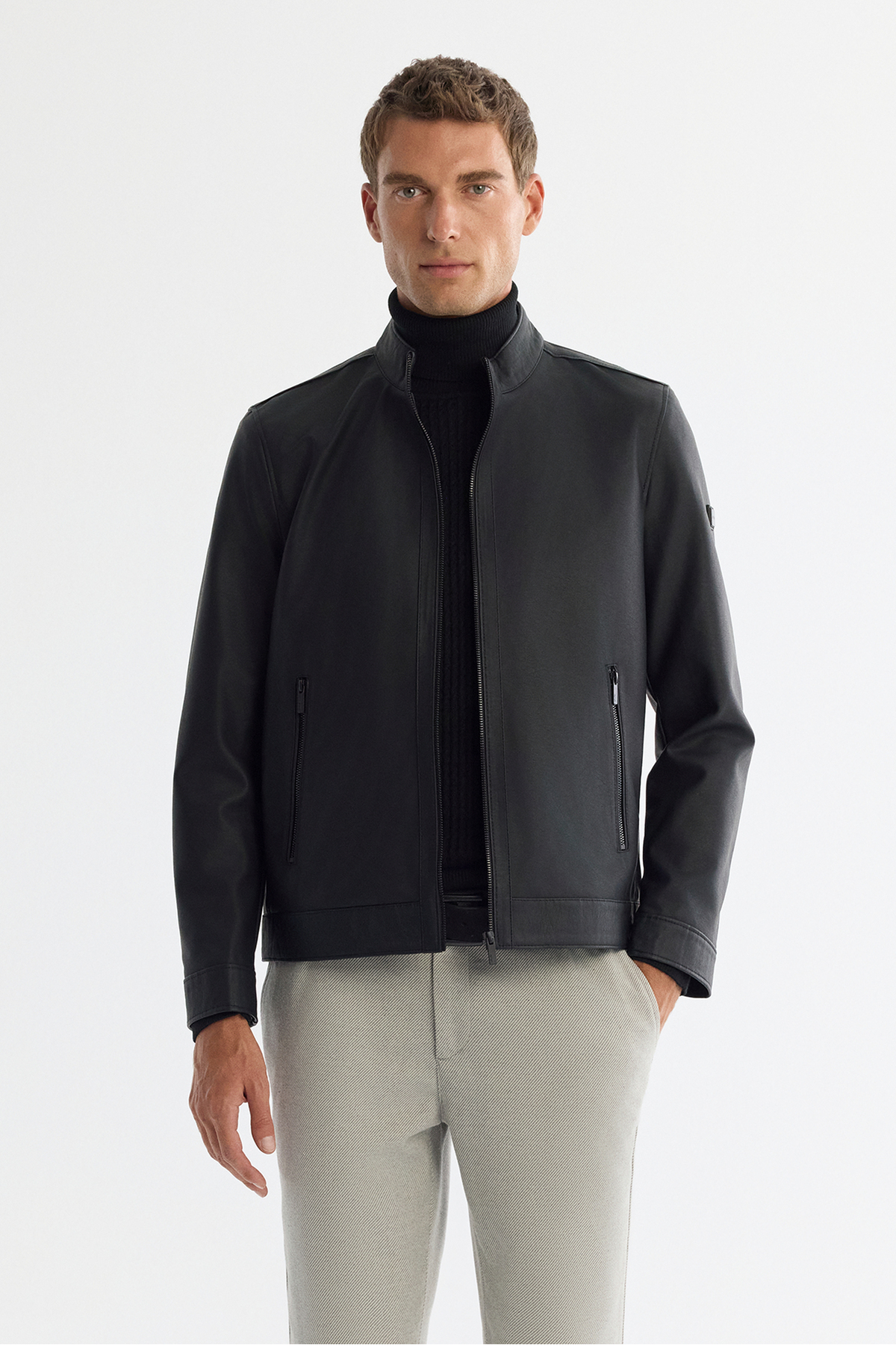 کت مردانهی نازک چرمی زیپدار یقه ایستاده مشکی B006005