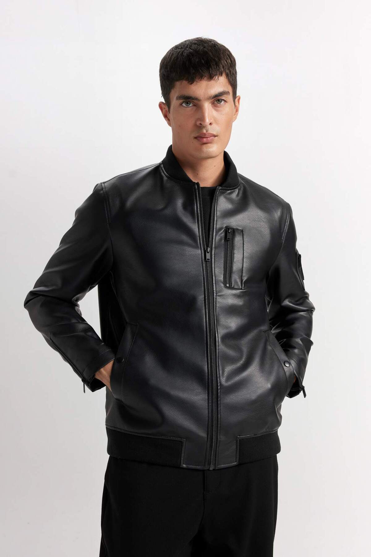 دفاکتو کاپشن فصلی ضد آب یقه کالج Bomber با جیب زیپدار و چرم مصنوعی D6245AX25SP