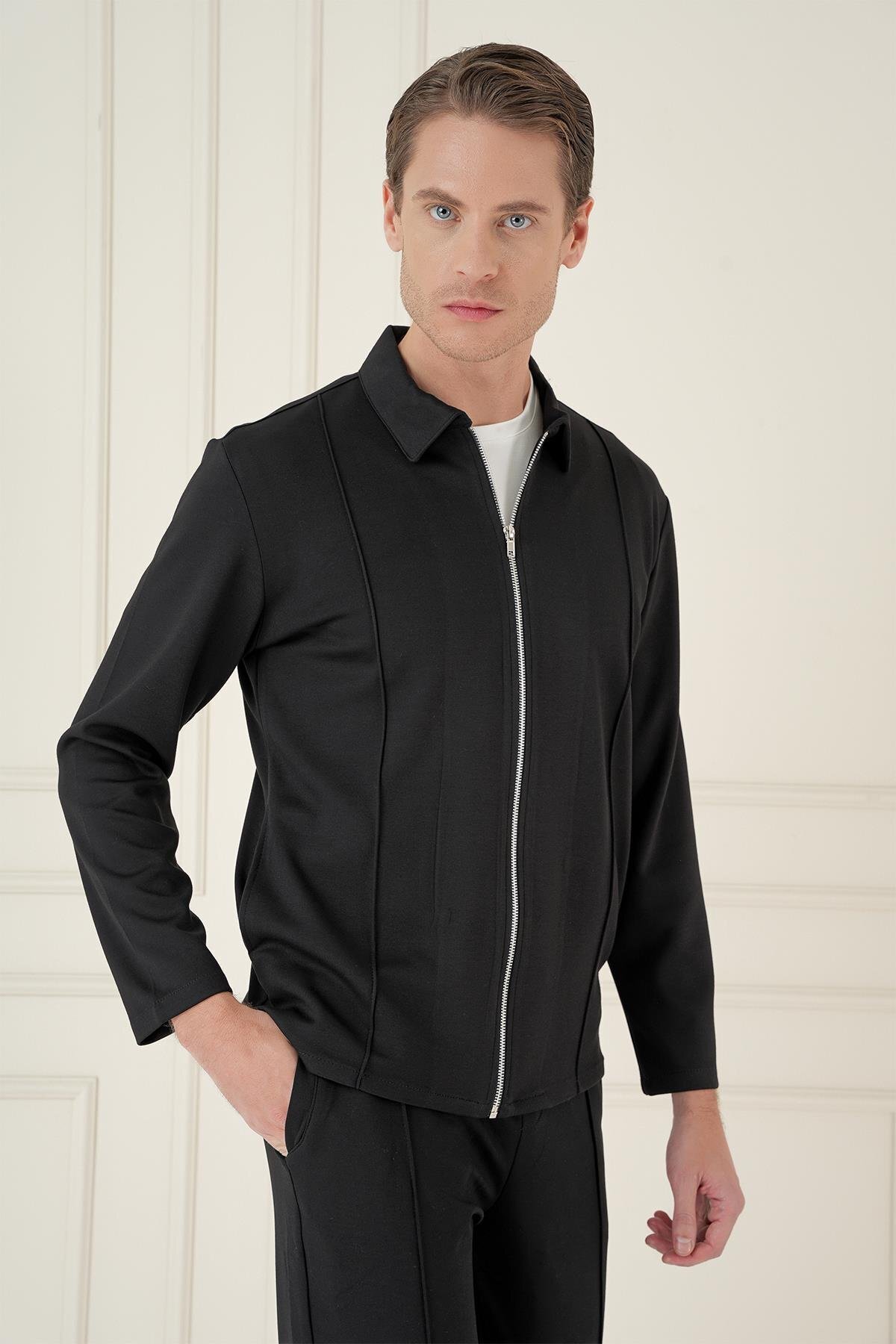 ایفور کاپشن مشکی فصلی و غیررسمی باریک و زیپدار با جیب کناری، مدل Mt 174
