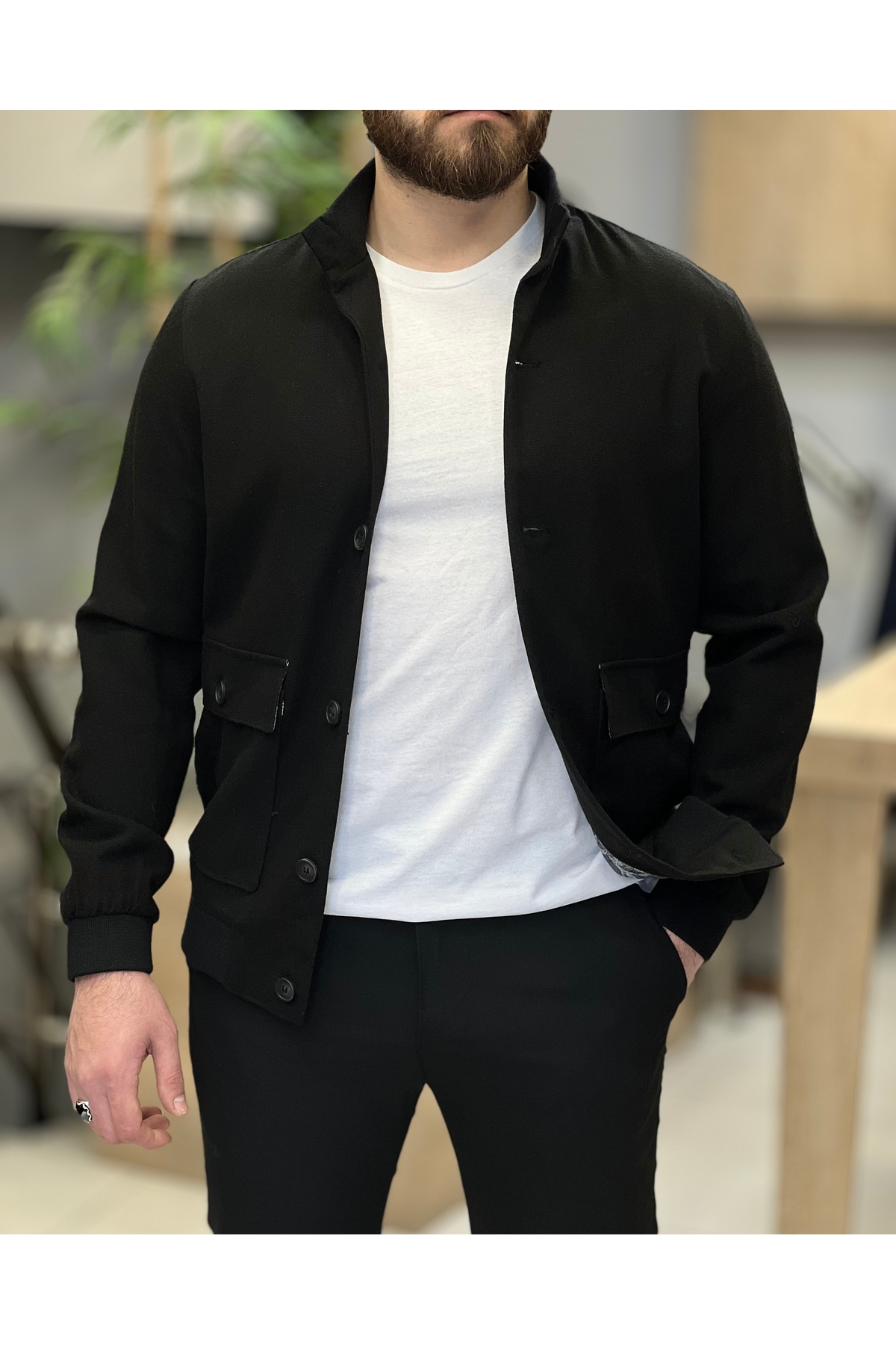 ساوارا کاپشن مردانه نخی فصلی، یقه ایستاده معمولی، مشکی، دکمهدار