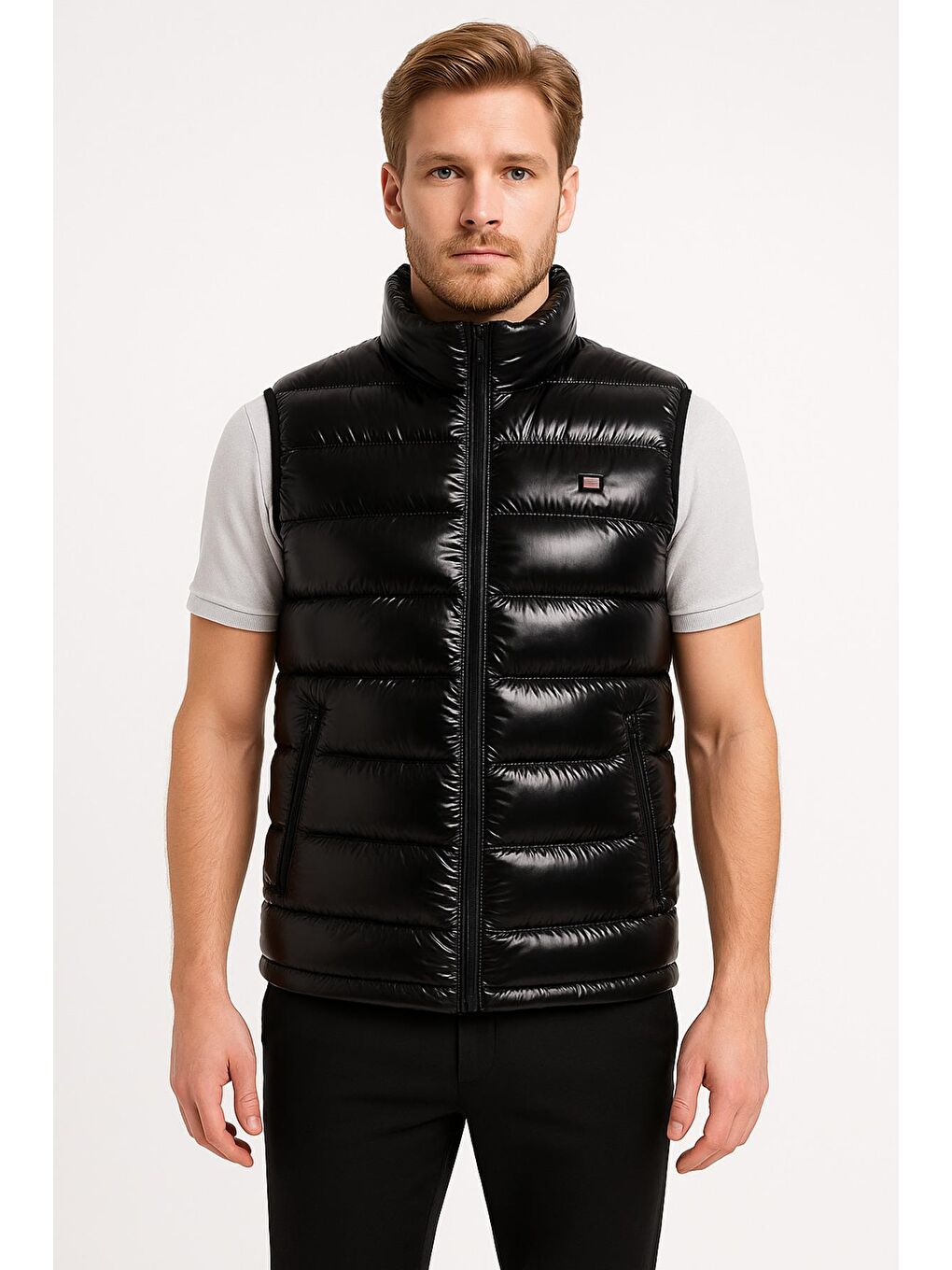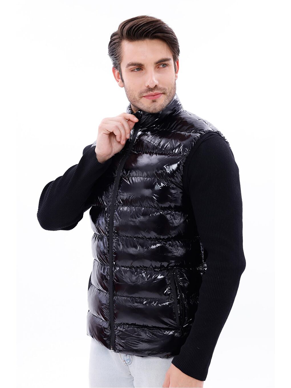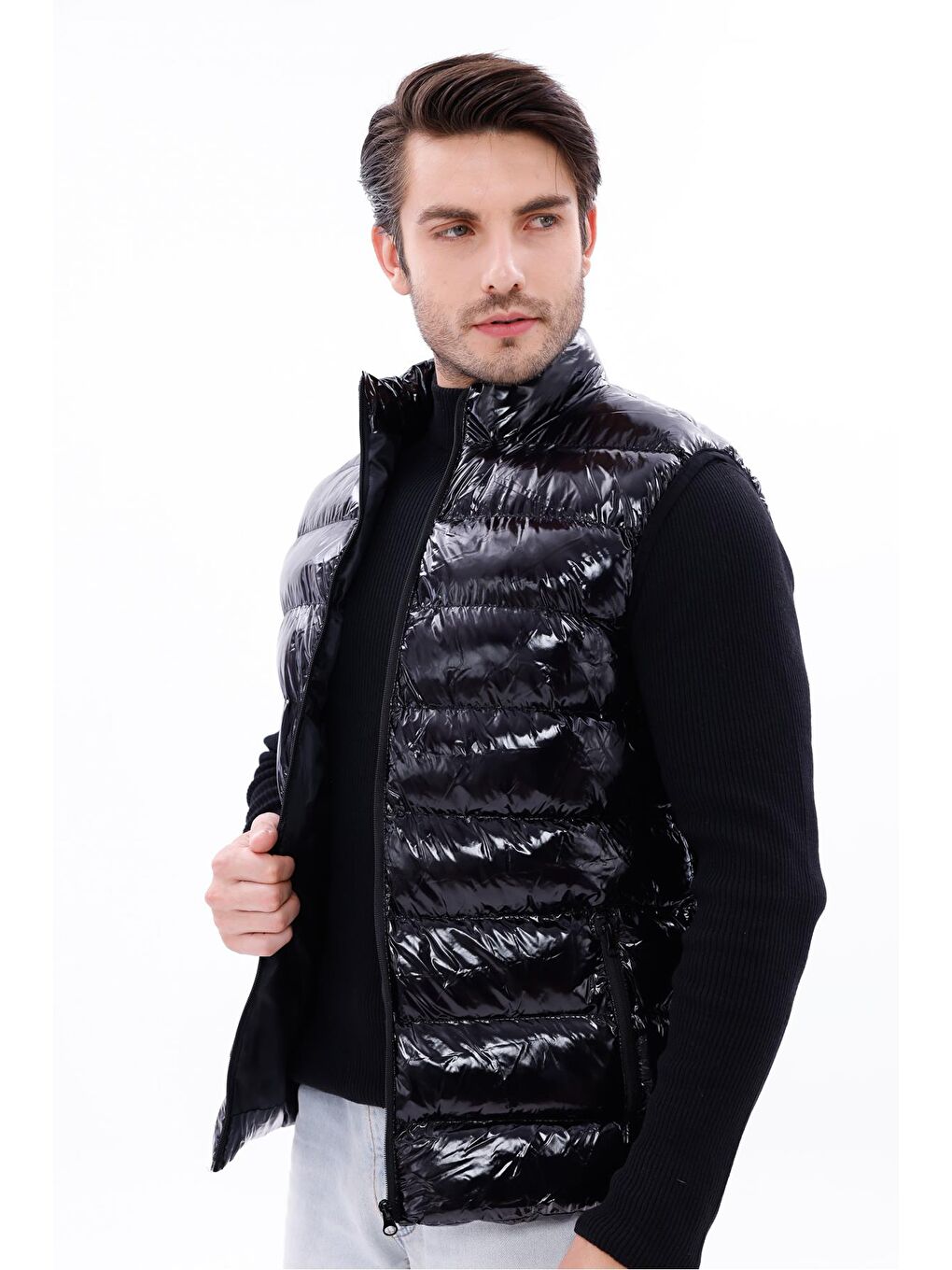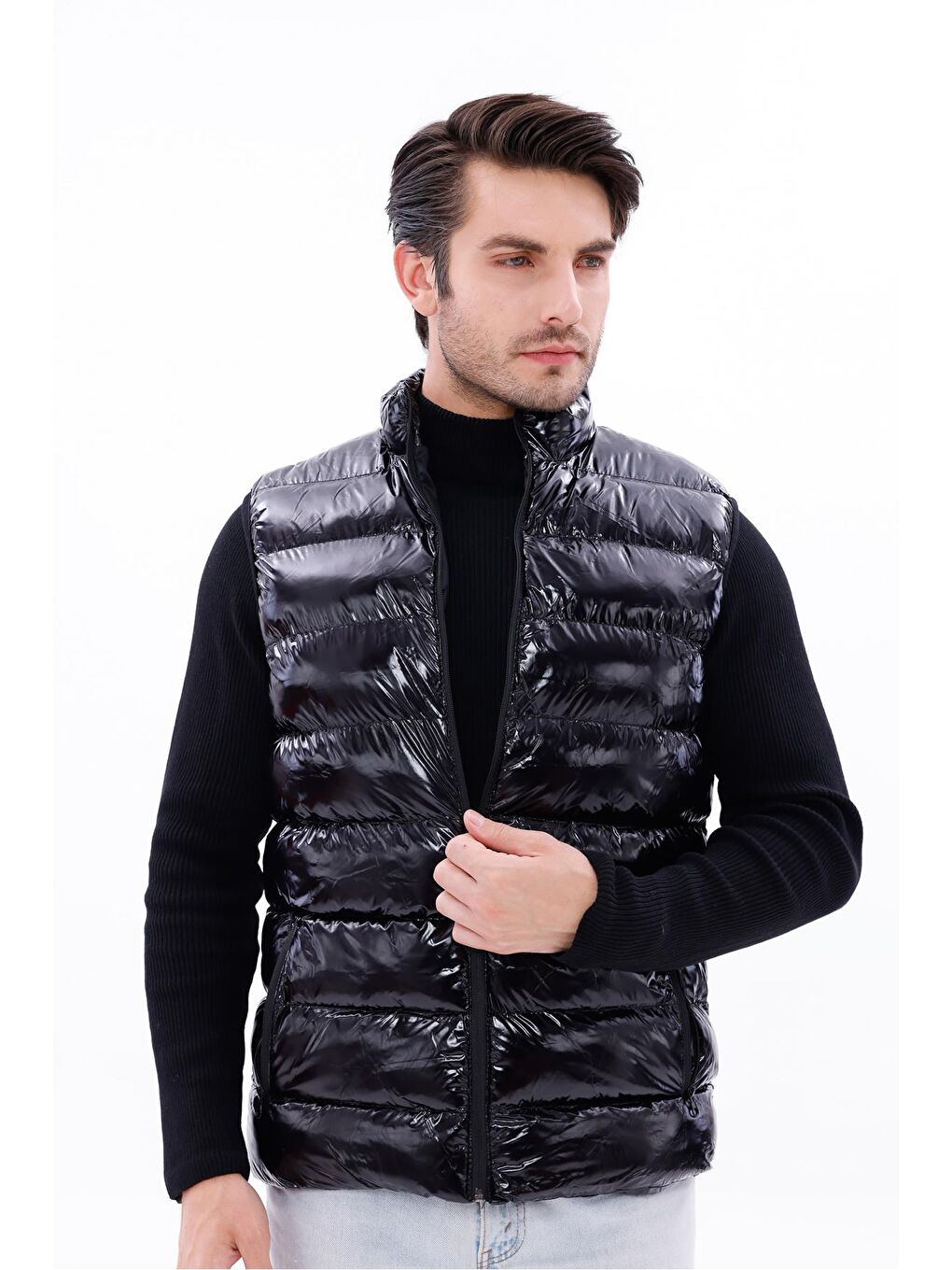 جلیقه پفی پارچهای براق مشکی مردانه