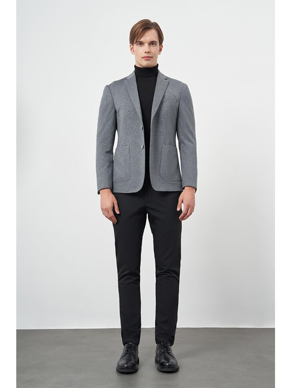 اندازههای مدل قد: 188 سانتیمتر سینه: 100 سانتیمتر دور کمر: 79 سانتیمتر باسن: 96 سانتیمتر اندازه مدل بر اساس دستهبندی پیراهن: M کت و شلوار: تناسب باریک = 50 / تناسب راحت = 48 ژاکت: تناسب باریک = 50 لباس راحت: 48 تن تناسب = 42 شلوار جین: 32 لباس بافتنی: MPoin: Comfort Fit: 48 کت: Comfort Fit: 48 کت: M-48 ترکیب پارچه: 60% پلی استر 40% ویسکوز کیفیت: 2 دکمه تناسب: باریک فیت جزئیات جنس: روکش بافتنی: D6 روکش بافتنی