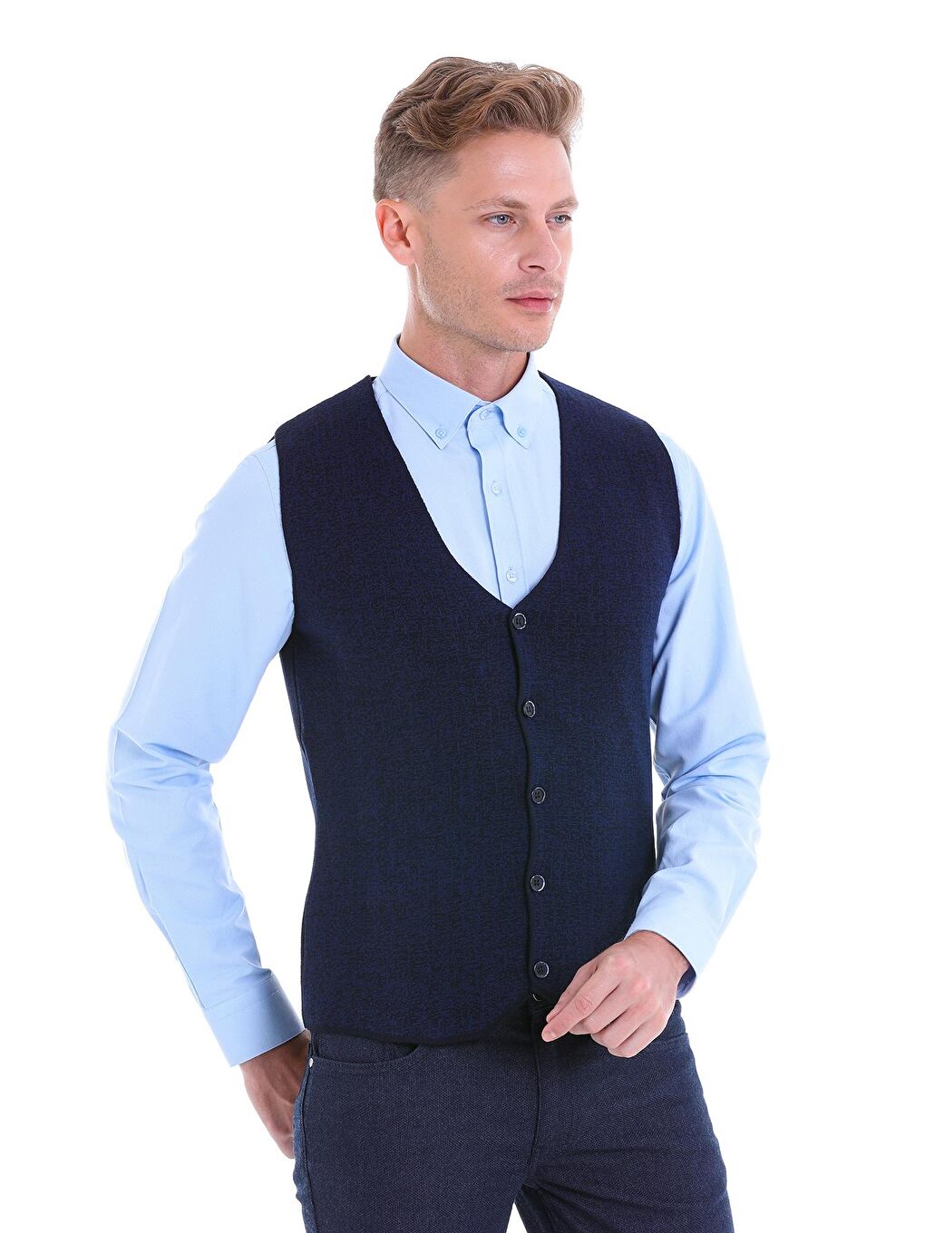 جلیقه بافتنی کلاسیک پشمی یقه V با طرح راحتی آبی سرمه ای