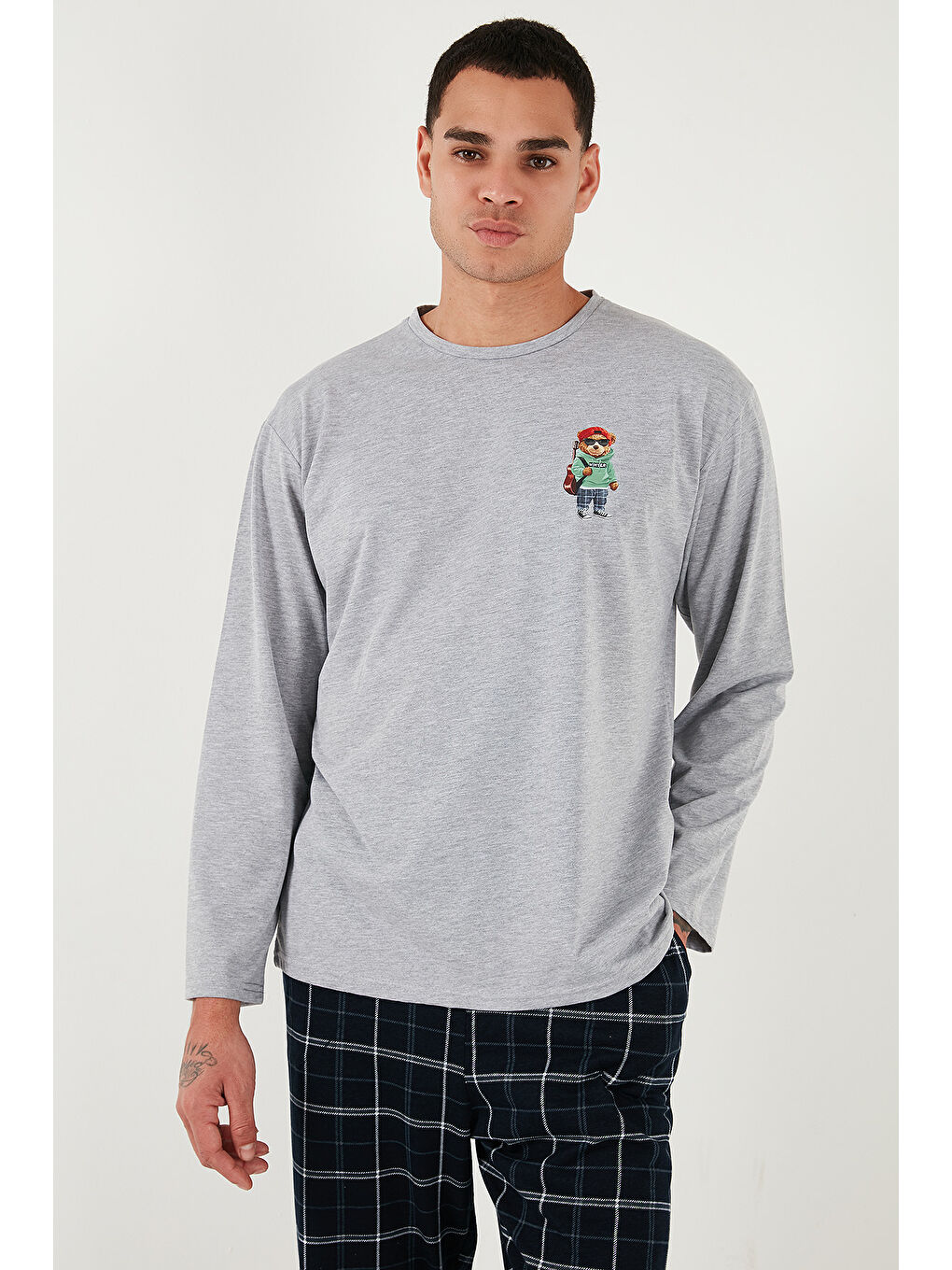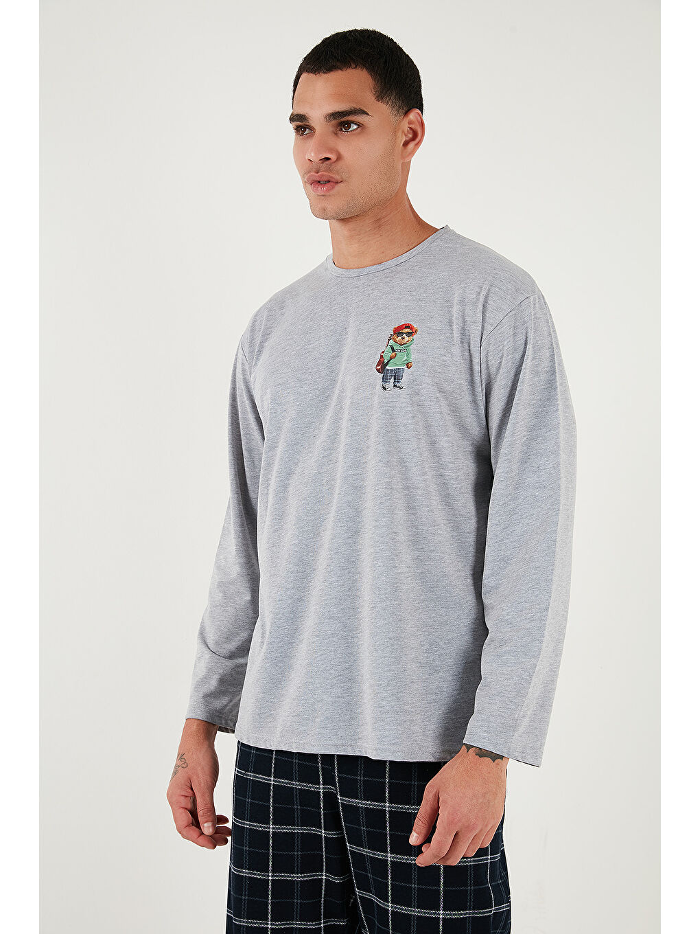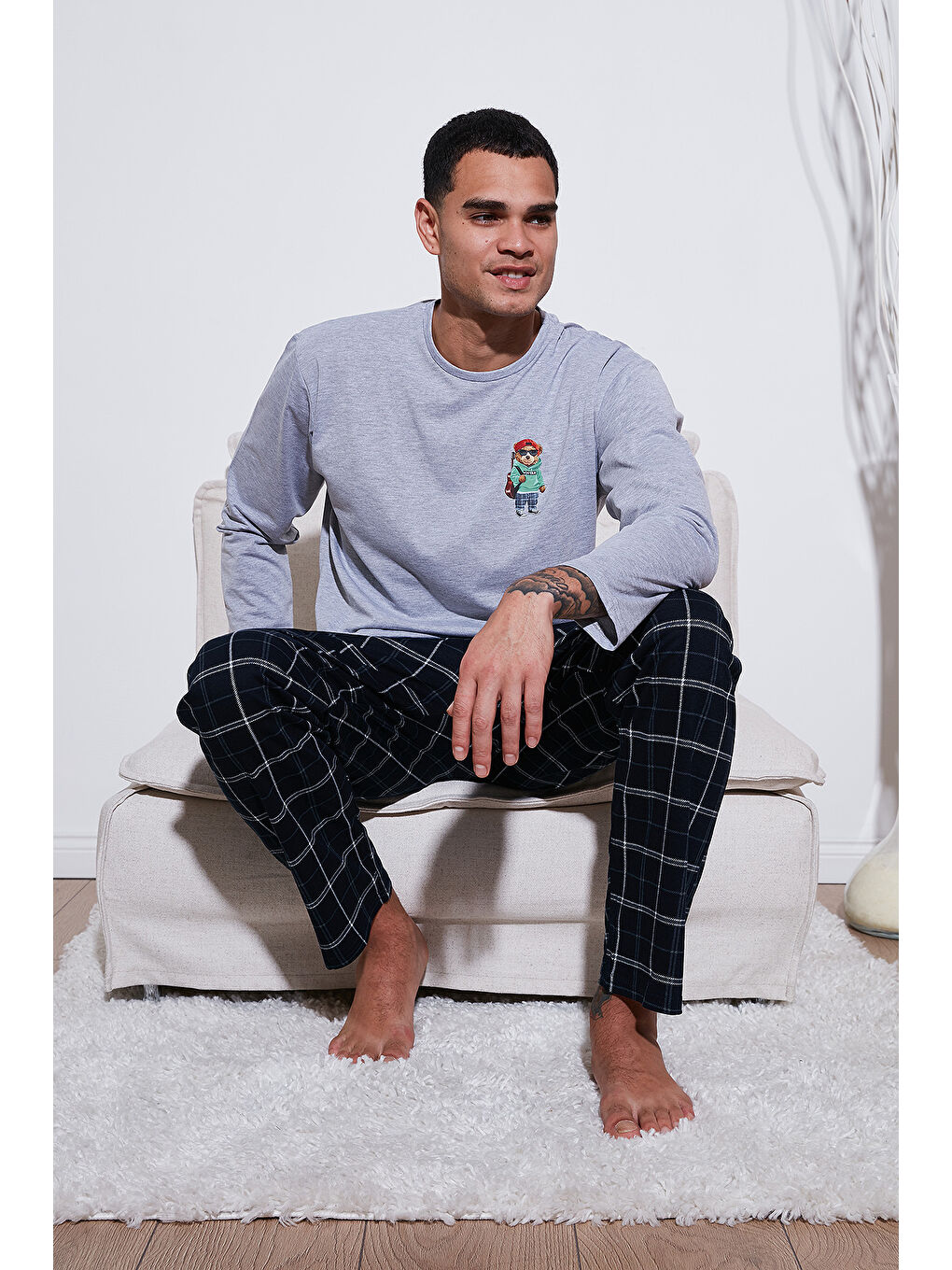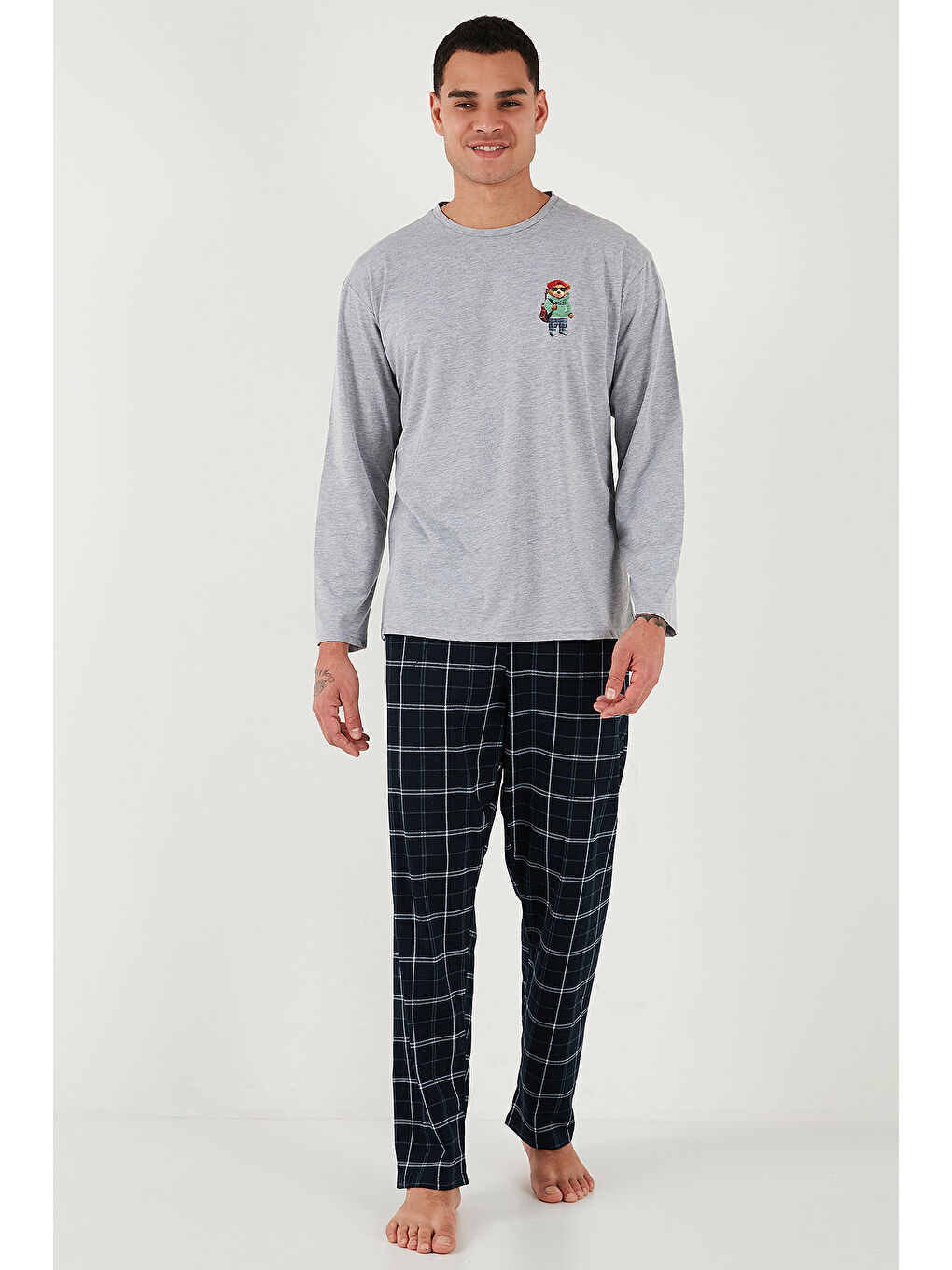 ست لباس خواب خاکستری چهارخانه یقه گرد، کمر بلند، جیب دار، سایز معمولی، کد ۶۵۷۴۰۰۲