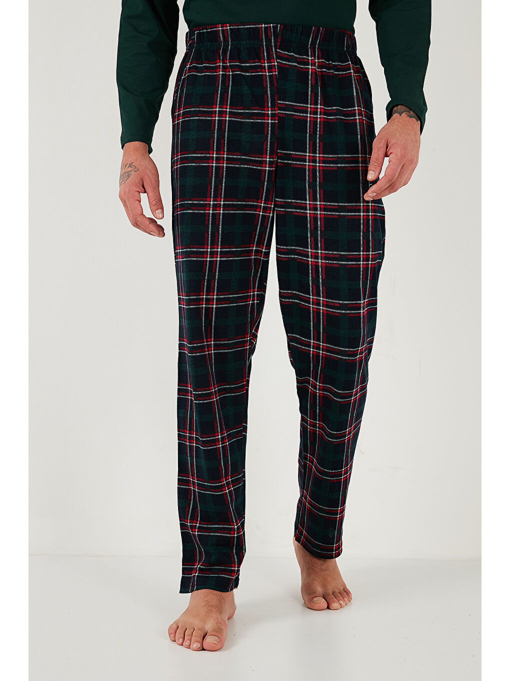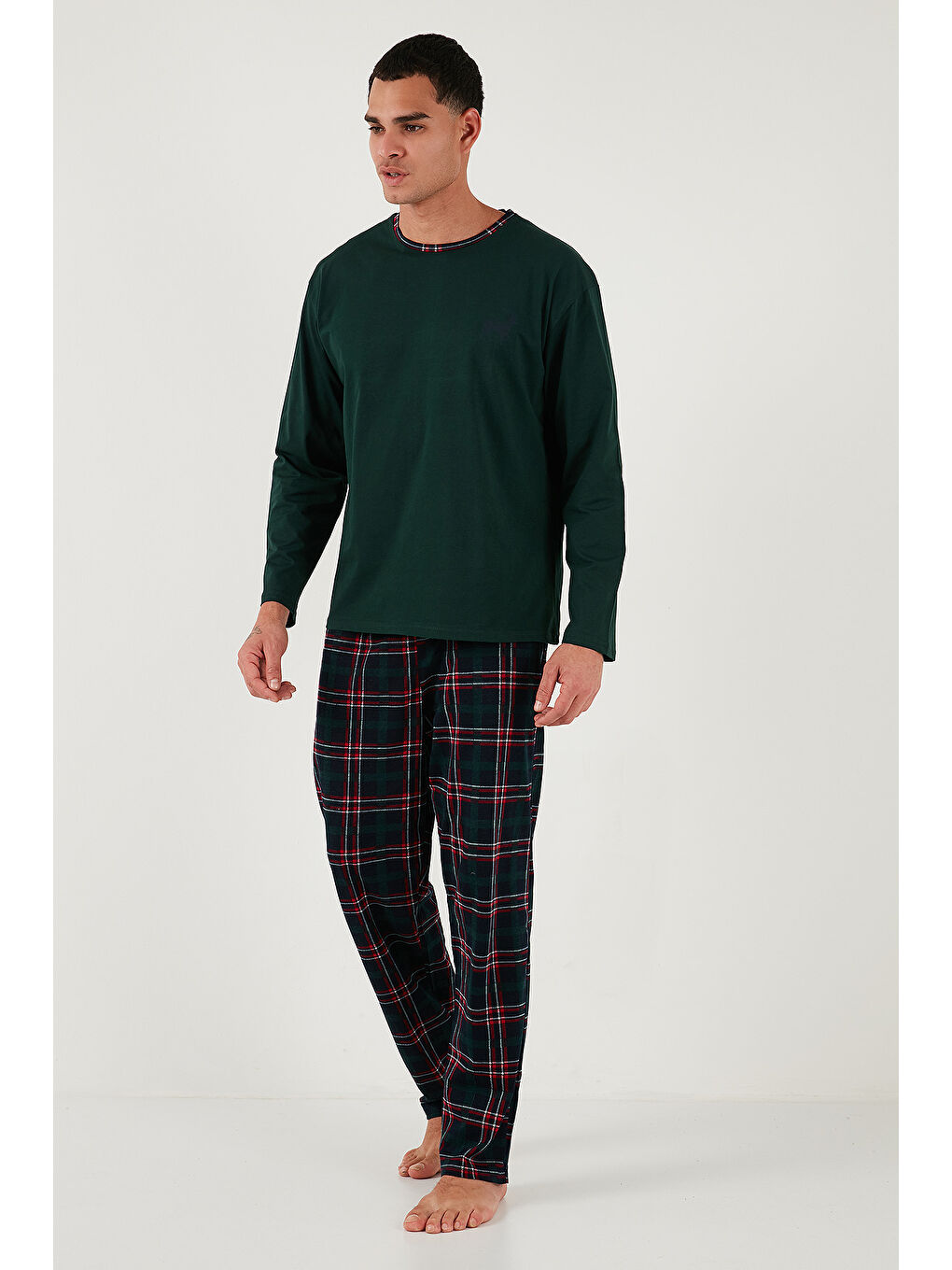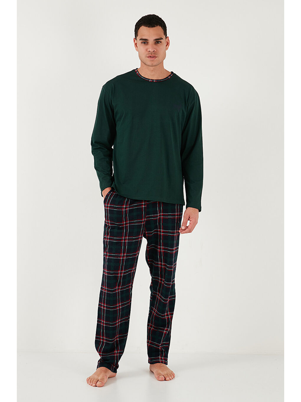 ست لباس خواب نخی سبز یقه گرد چهارخانه معمولی کد ۶۵۷۴۰۰۱