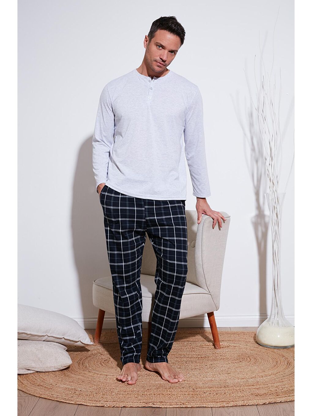 ست لباس خواب آستین بلند نخی خاکستری طرح دار کمر کشی معمولی کد ۶۵۷۲۰۰۳