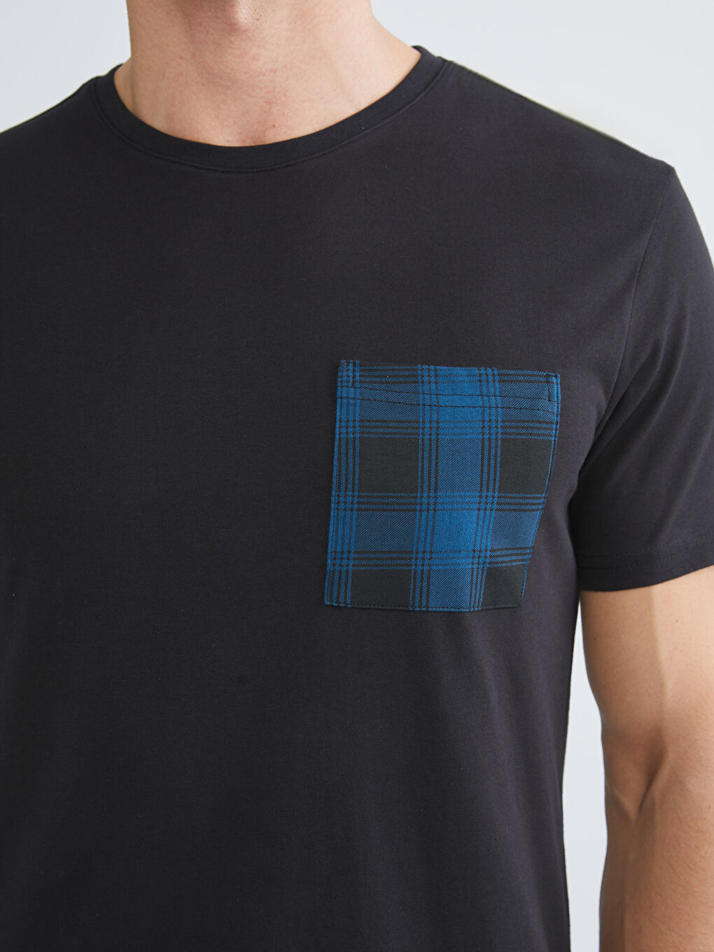 این تاپ مردانه دارای یقه گرد و آستین کوتاه است. دارای یک جیب تکی روی سینه با طرح چهارخانه است و از پارچه ۱۰۰٪ پنبه ساخته شده است.