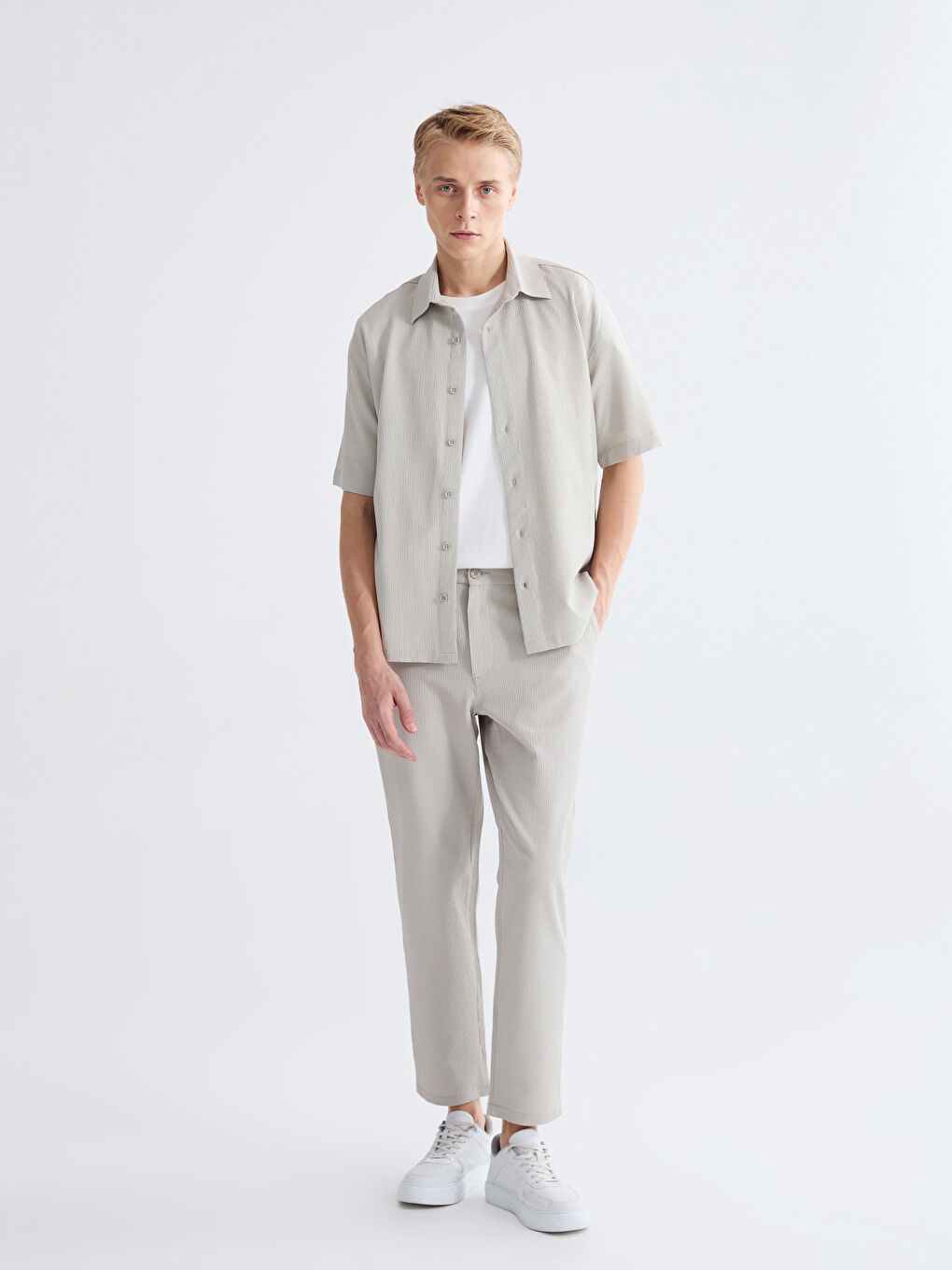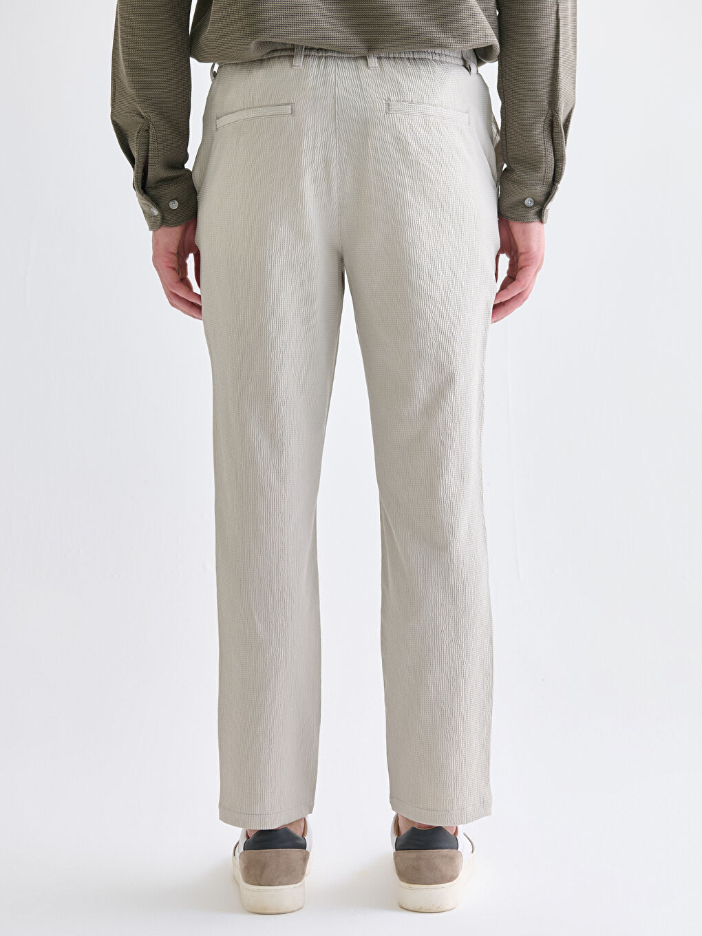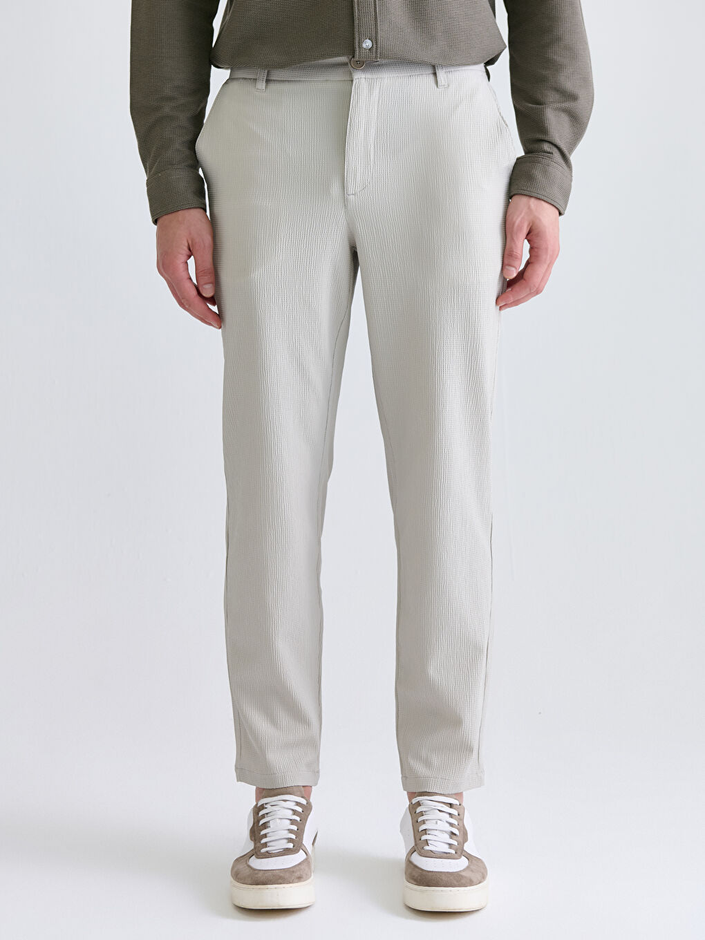 این شلوار مردانه با فیت استاندارد، از پارچه چیندار ساخته شده و برش دمپا راستهای دارد.