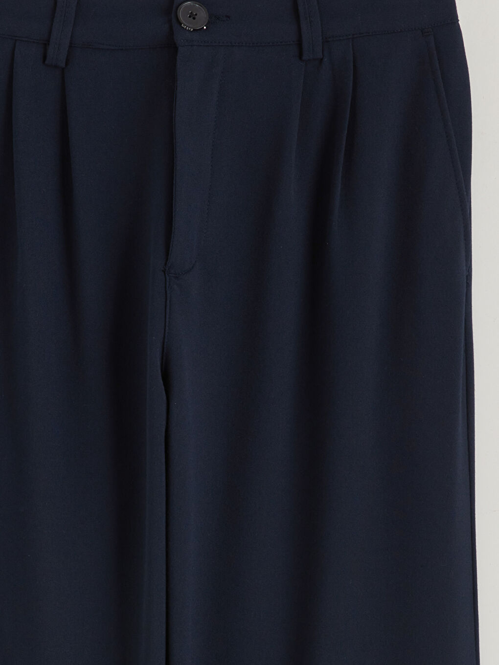 شلوار مردانه با فرم گشاد، چیندار در جلو، جیبهای کناری و دکمه.