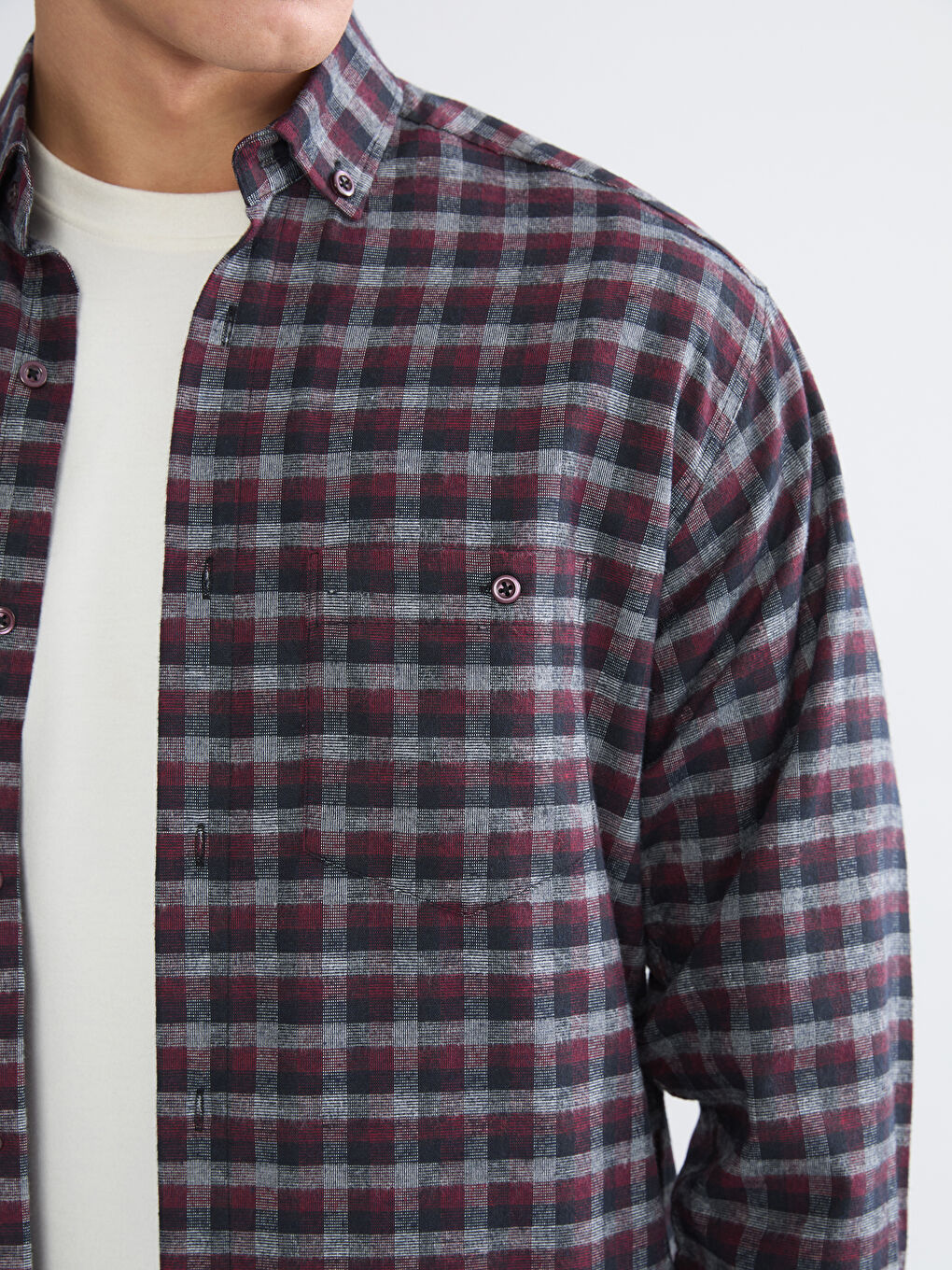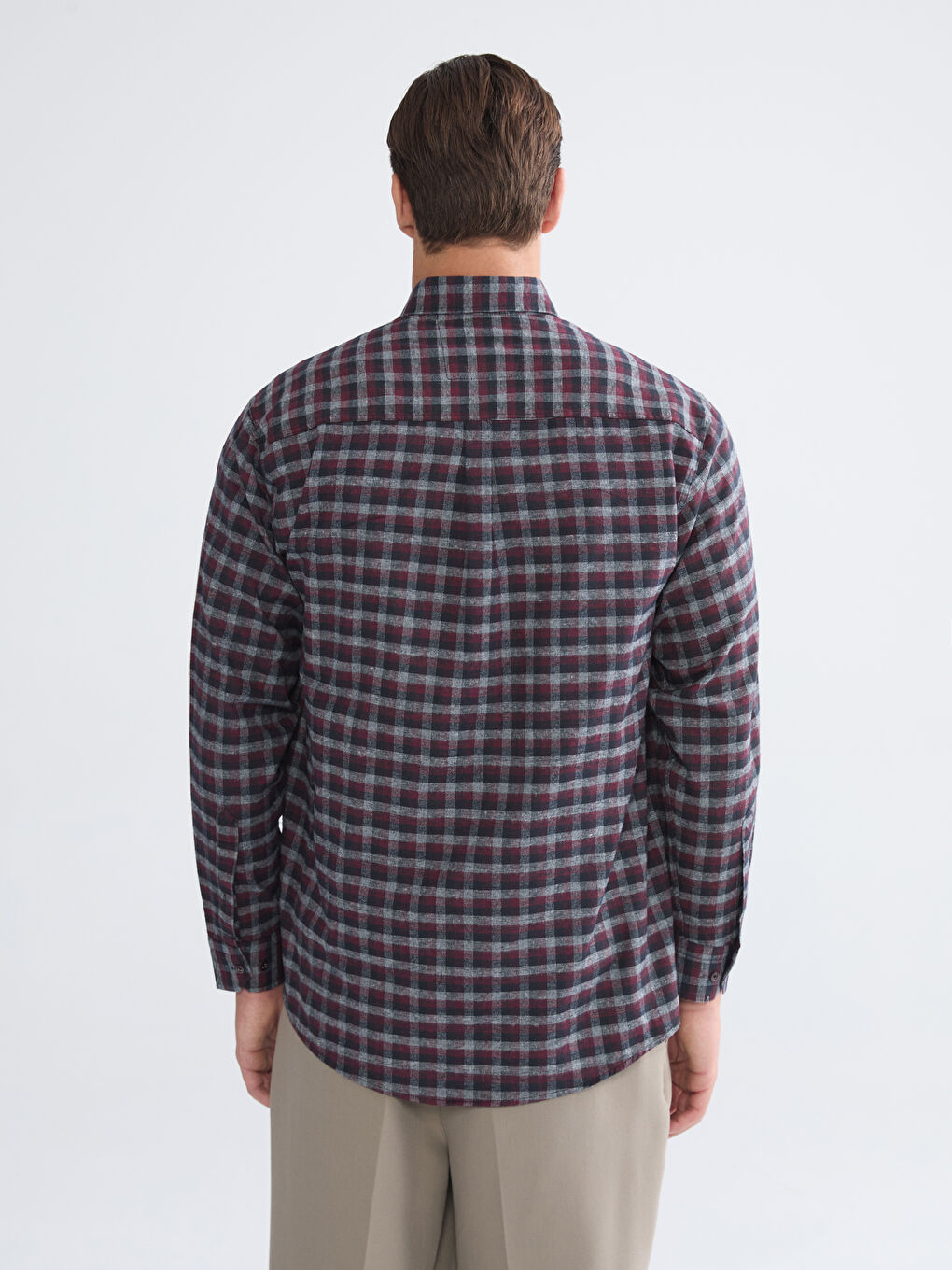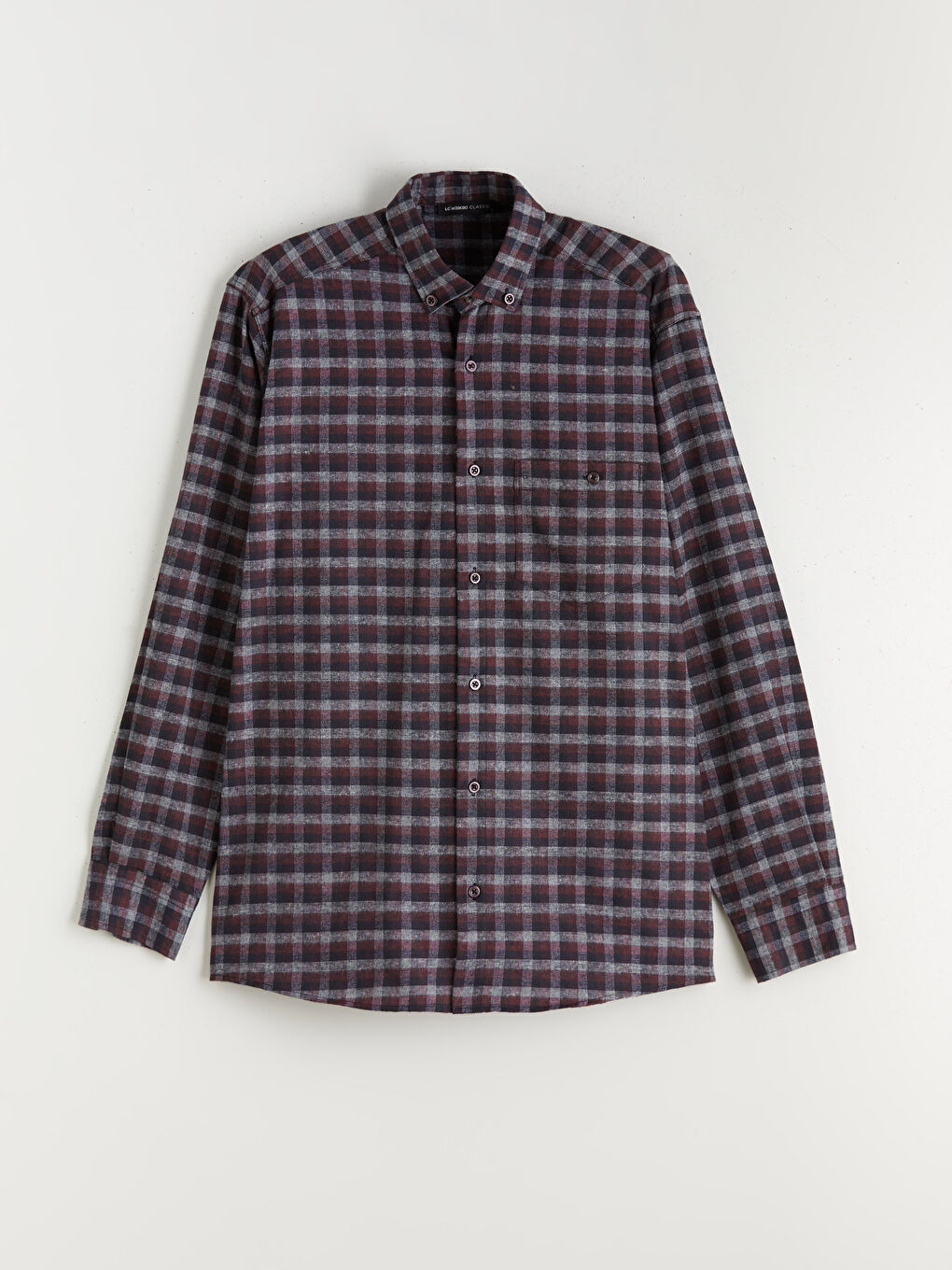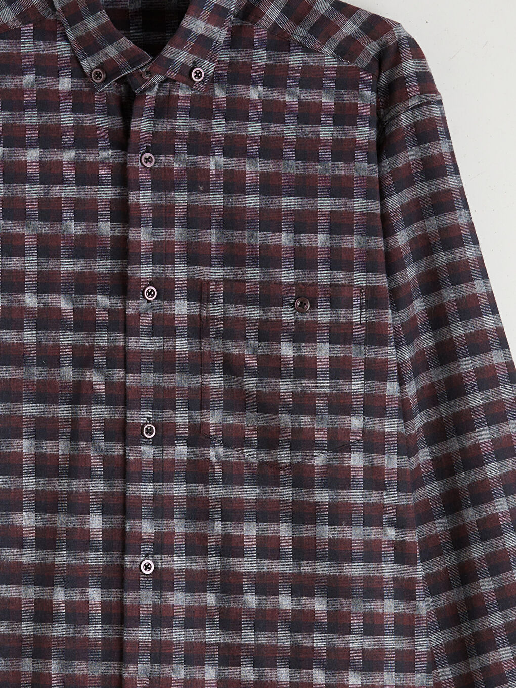 پیراهن چهارخانه مردانه از جنس پارچه گاباردین. یقه دکمهدار، آستین بلند، یک جیب روی سینه و جلو دکمهدار.