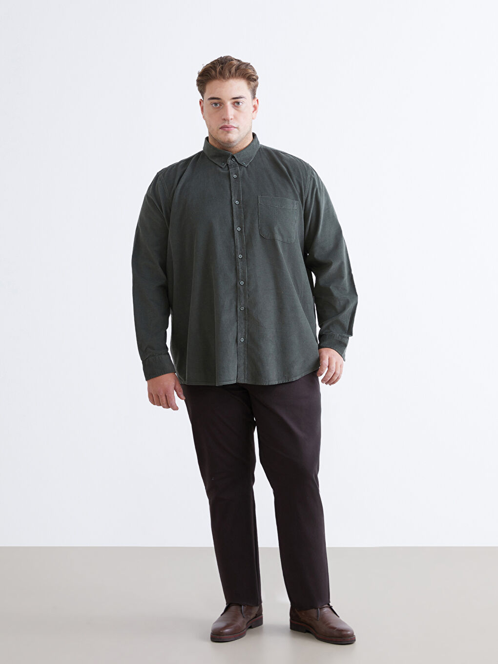 پیراهن مردانه آستین بلند که با الگوی فرم معمولی طراحی شده است، از پارچه مخمل تهیه شده است.