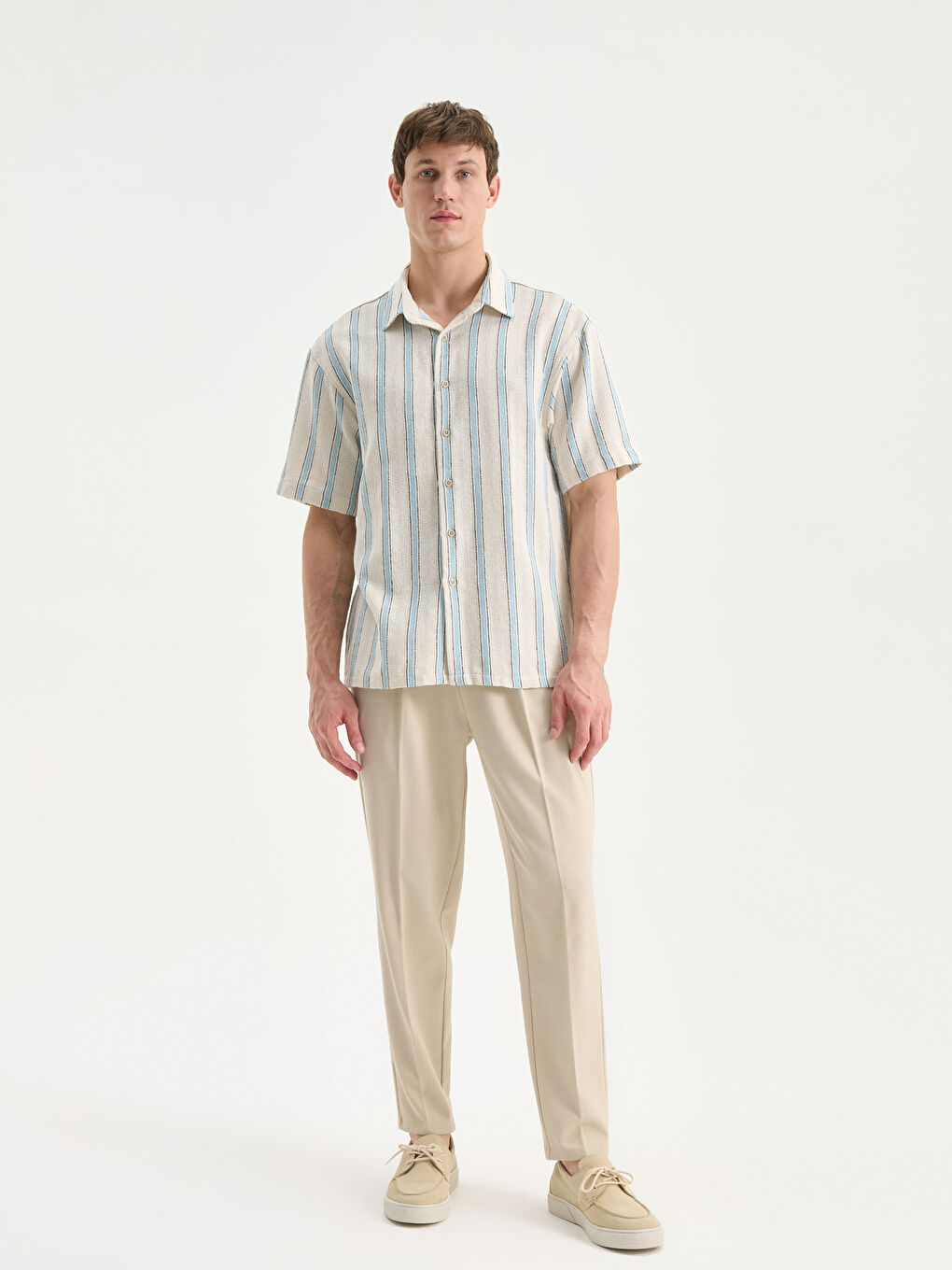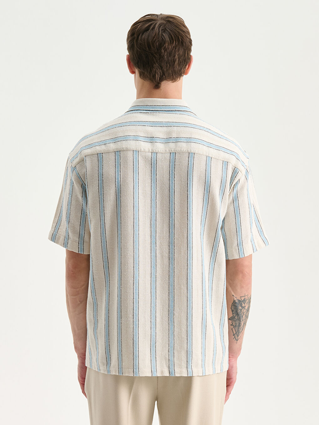 این پیراهن مردانه، با برش معمولی فیت، آستین کوتاه طراحی شده و از پارچه نخی طرح دار راه راه دوخته شده است.