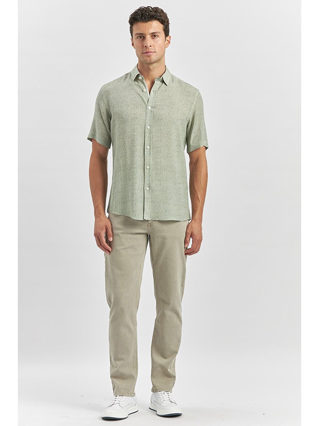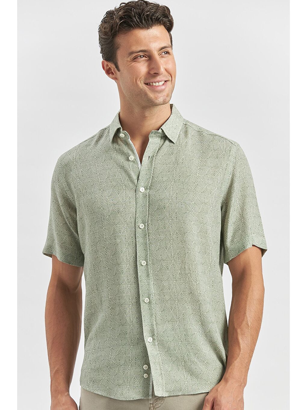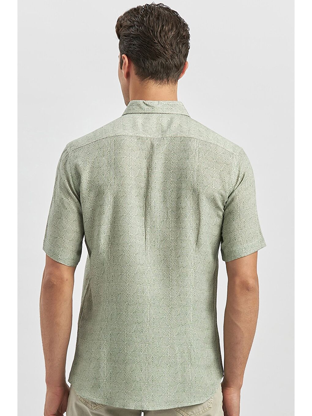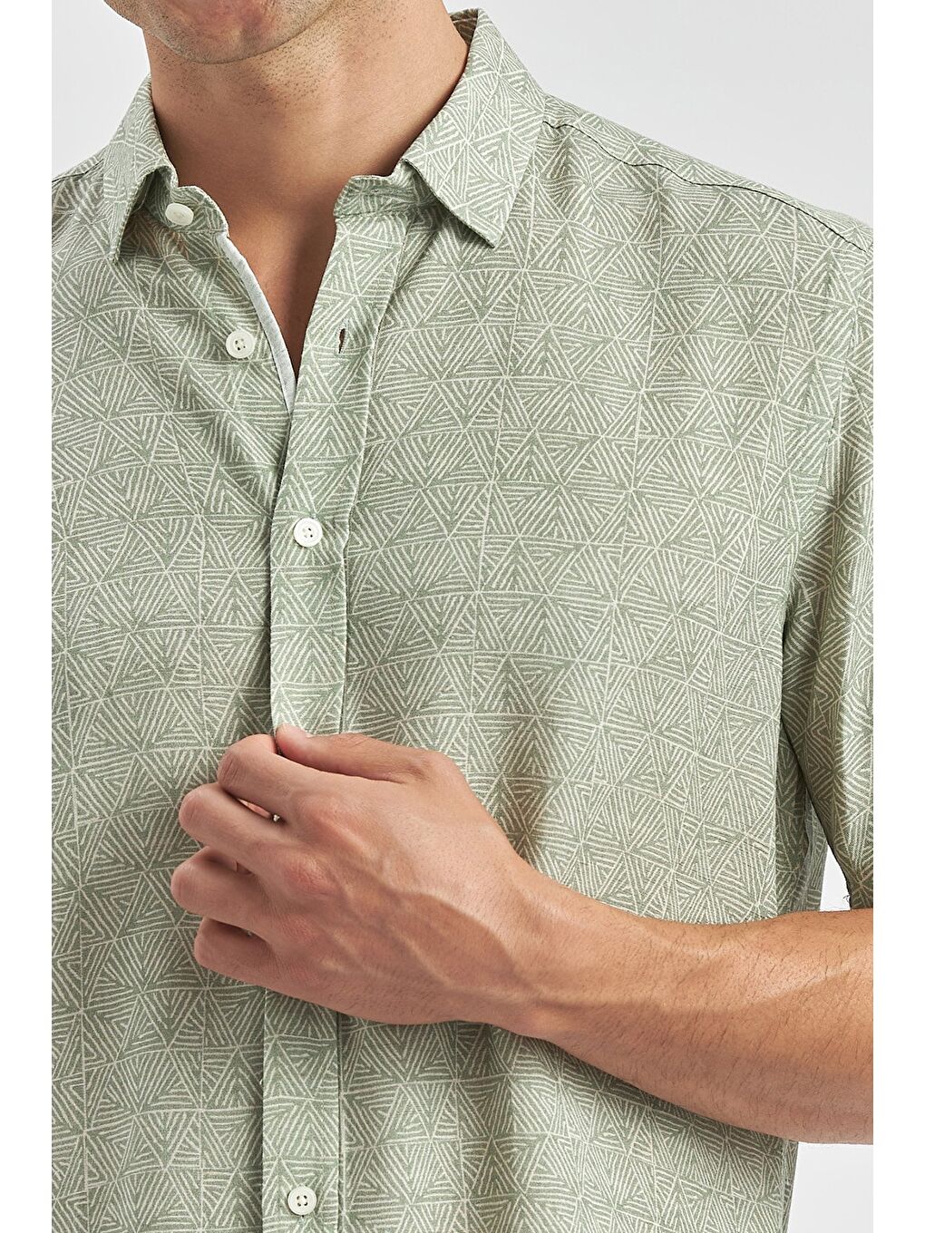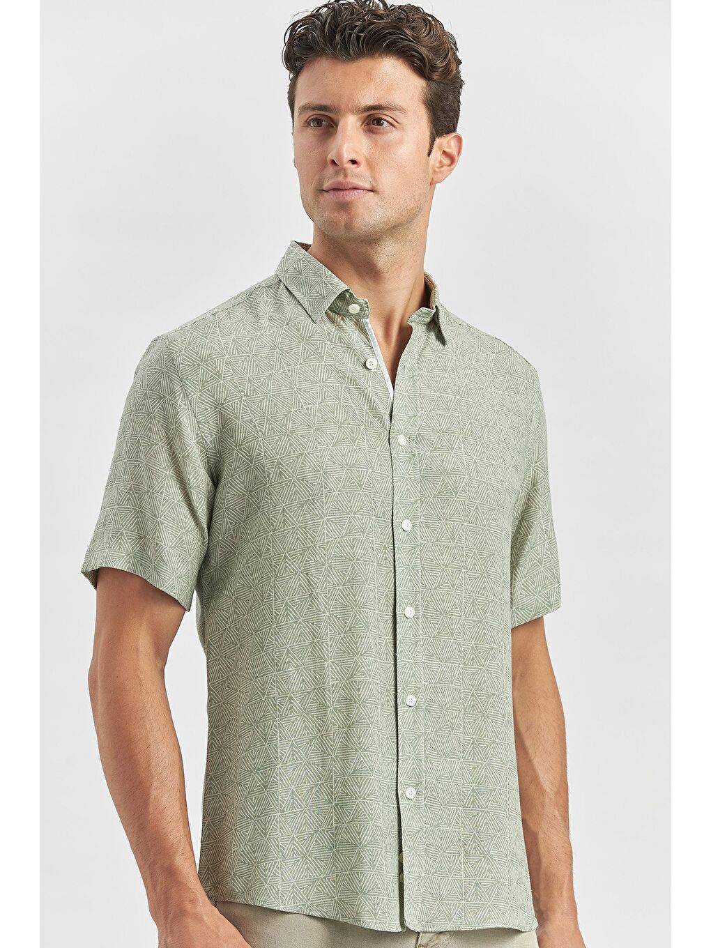 پیراهن کتانی آستین کوتاه یقه دکمهدار سبز تیره، مناسب برای استفاده روزمره، مدل اسلیم فیت، کد ۱۰۰۴۲۴۰۲۴۲