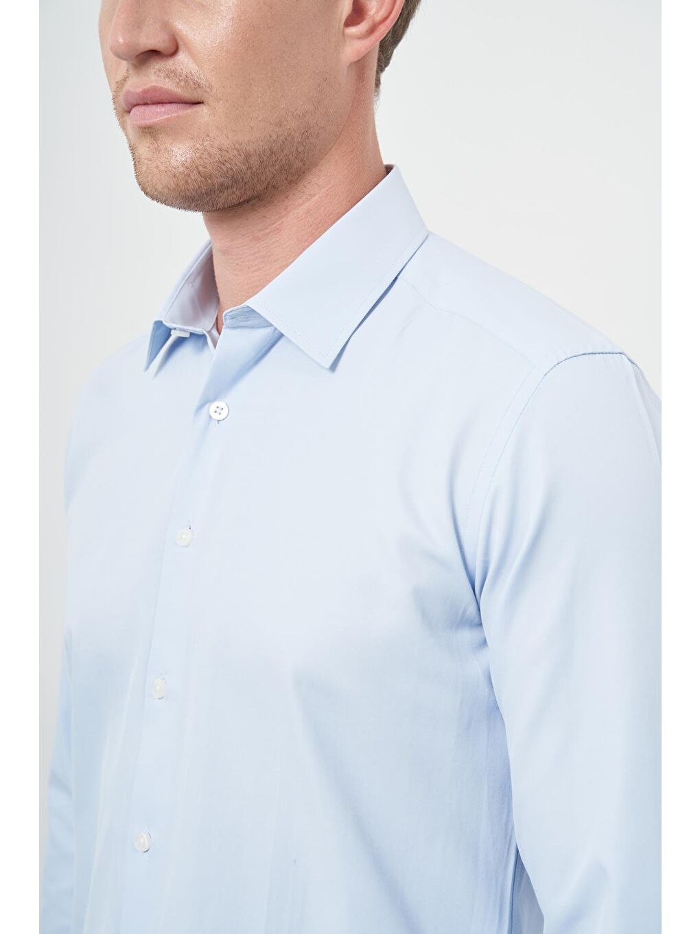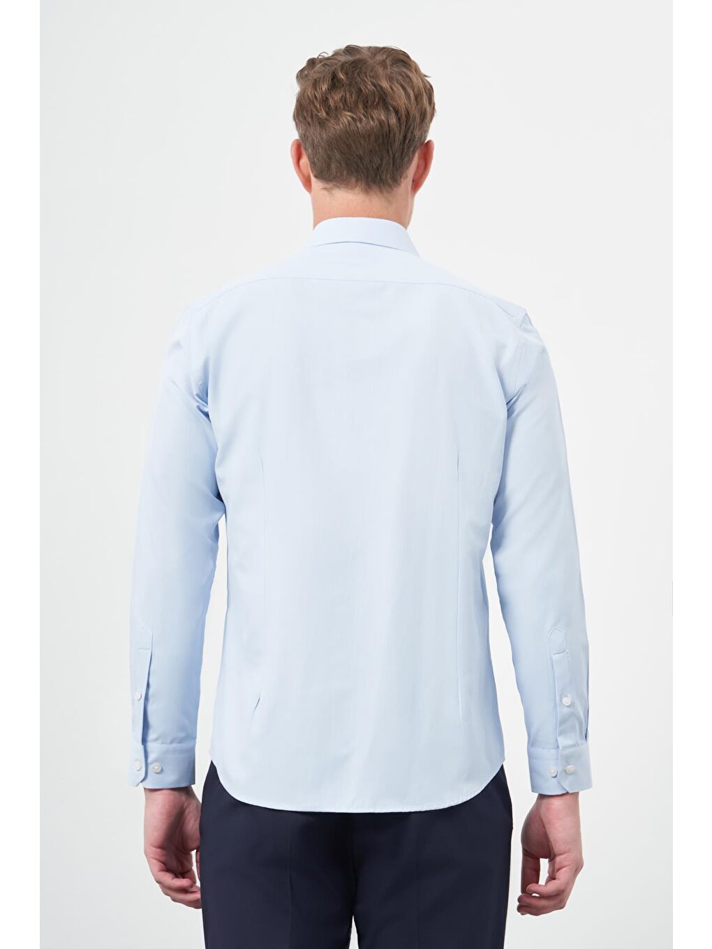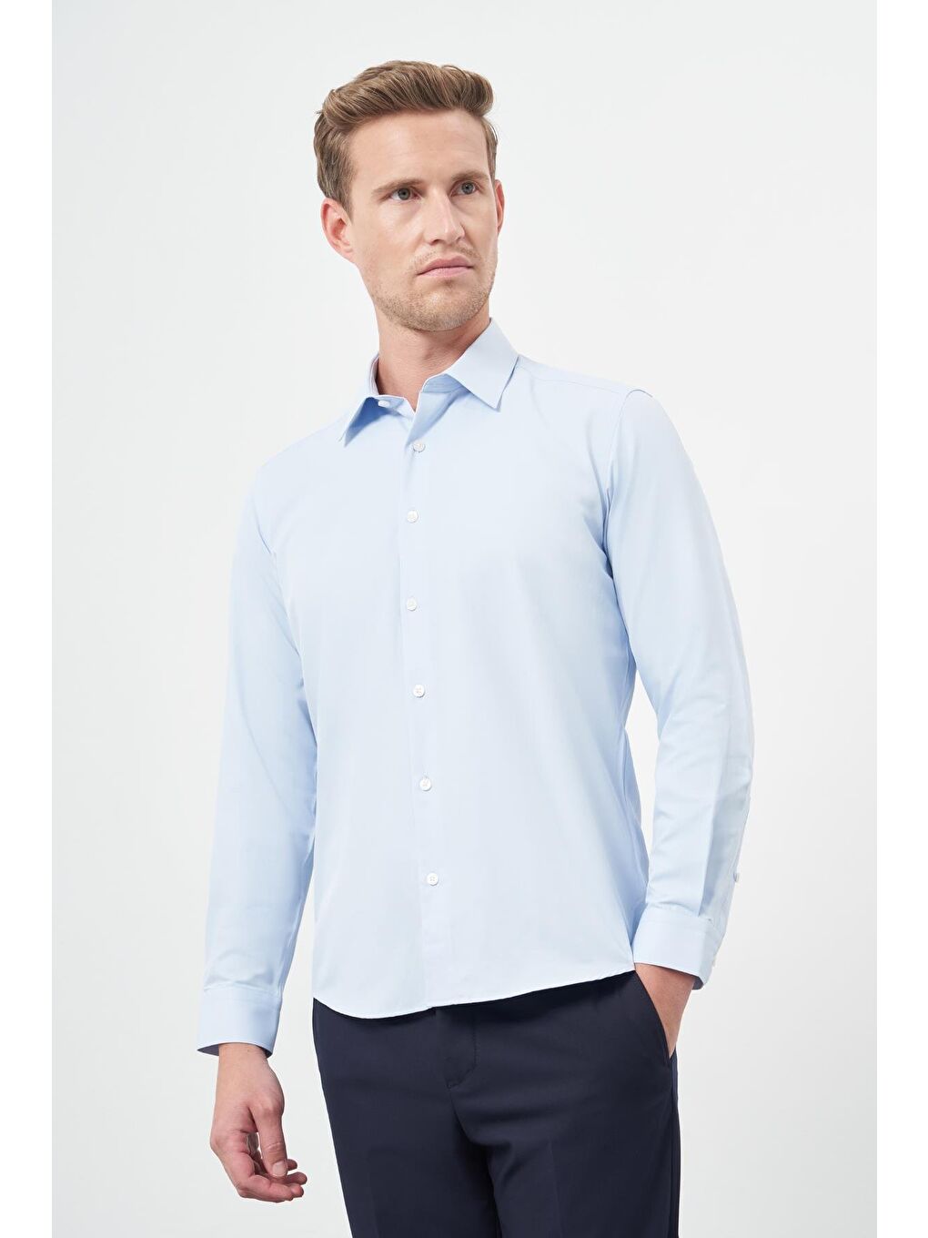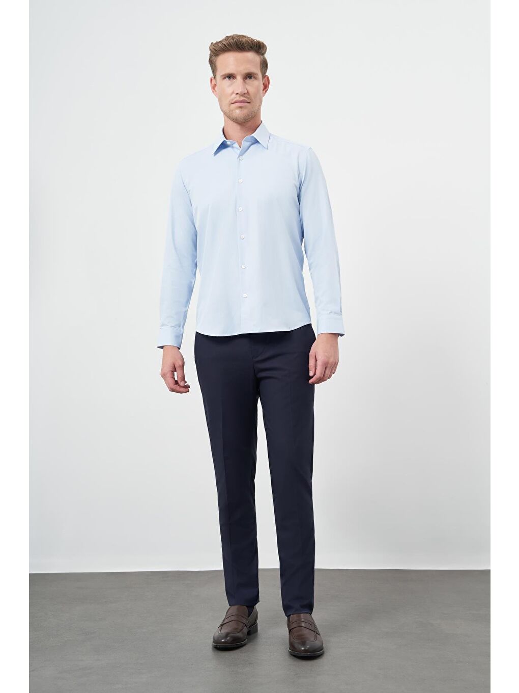 پیراهن نخی کلاسیک اسلیم فیت، ساده، یقه گرد، آستین بلند سرمهای تیره، کد ۱۰۰۴۲۴۵۲۶۷