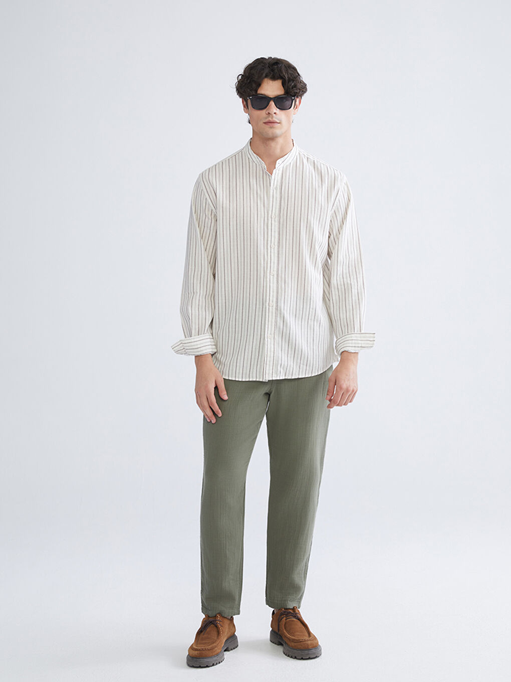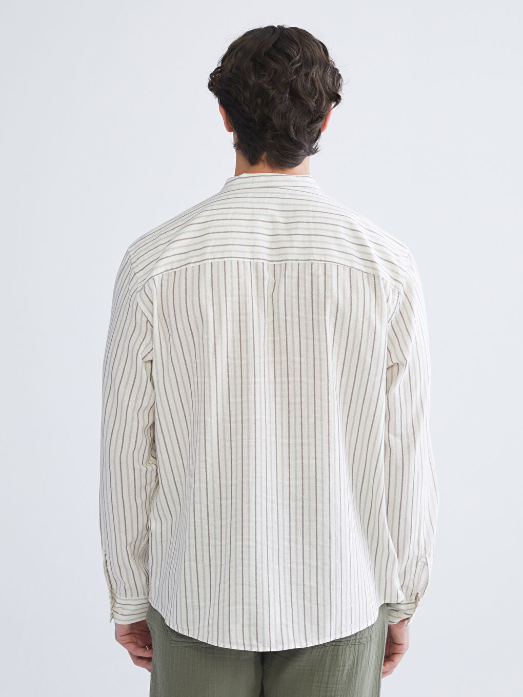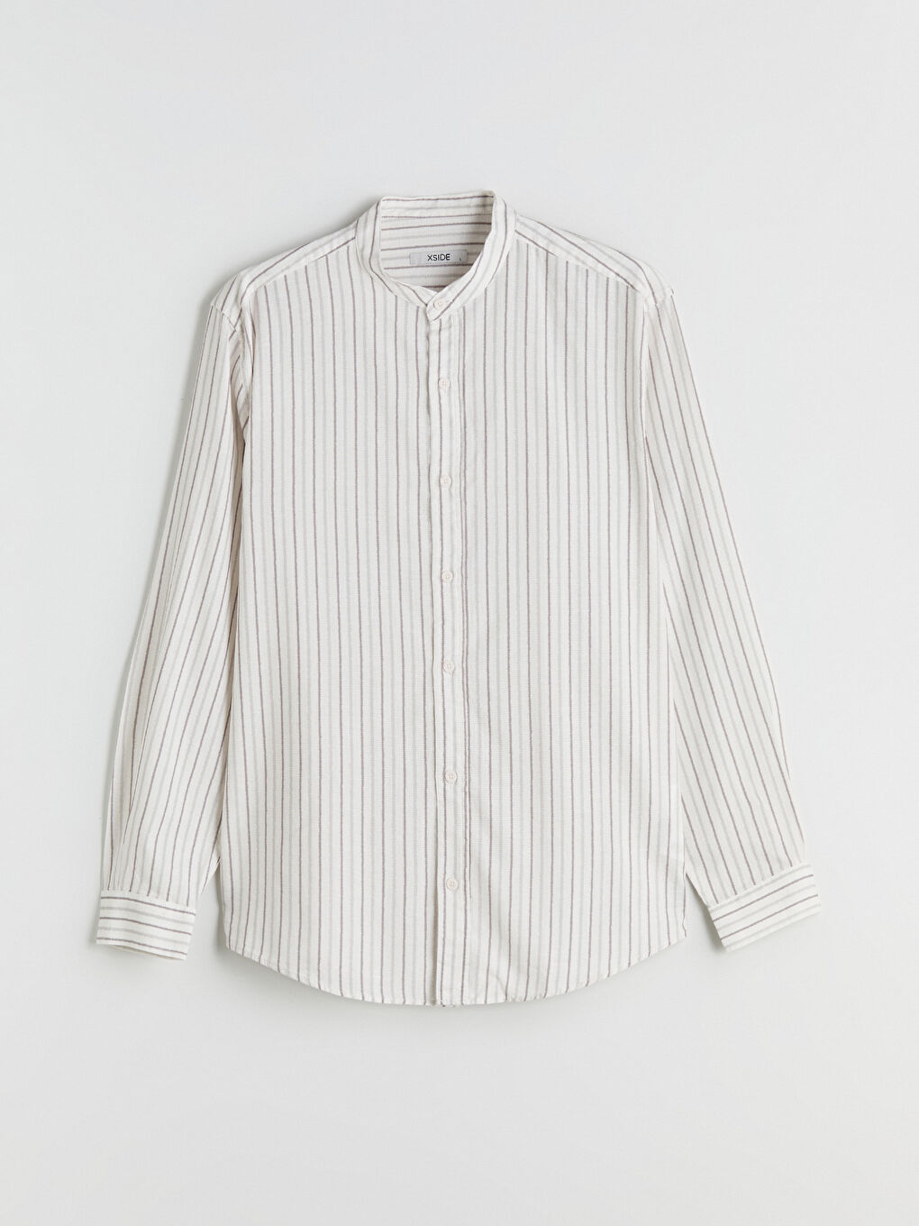 پیراهن مردانه راه راه آستین بلند یقه ایستاده بژ معمولی
