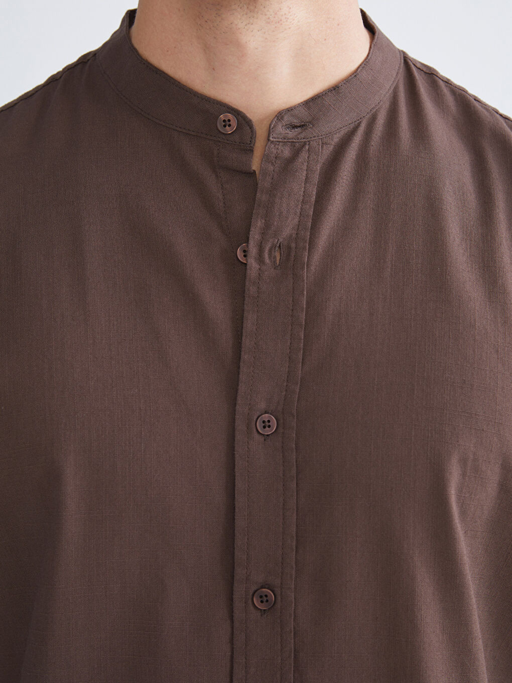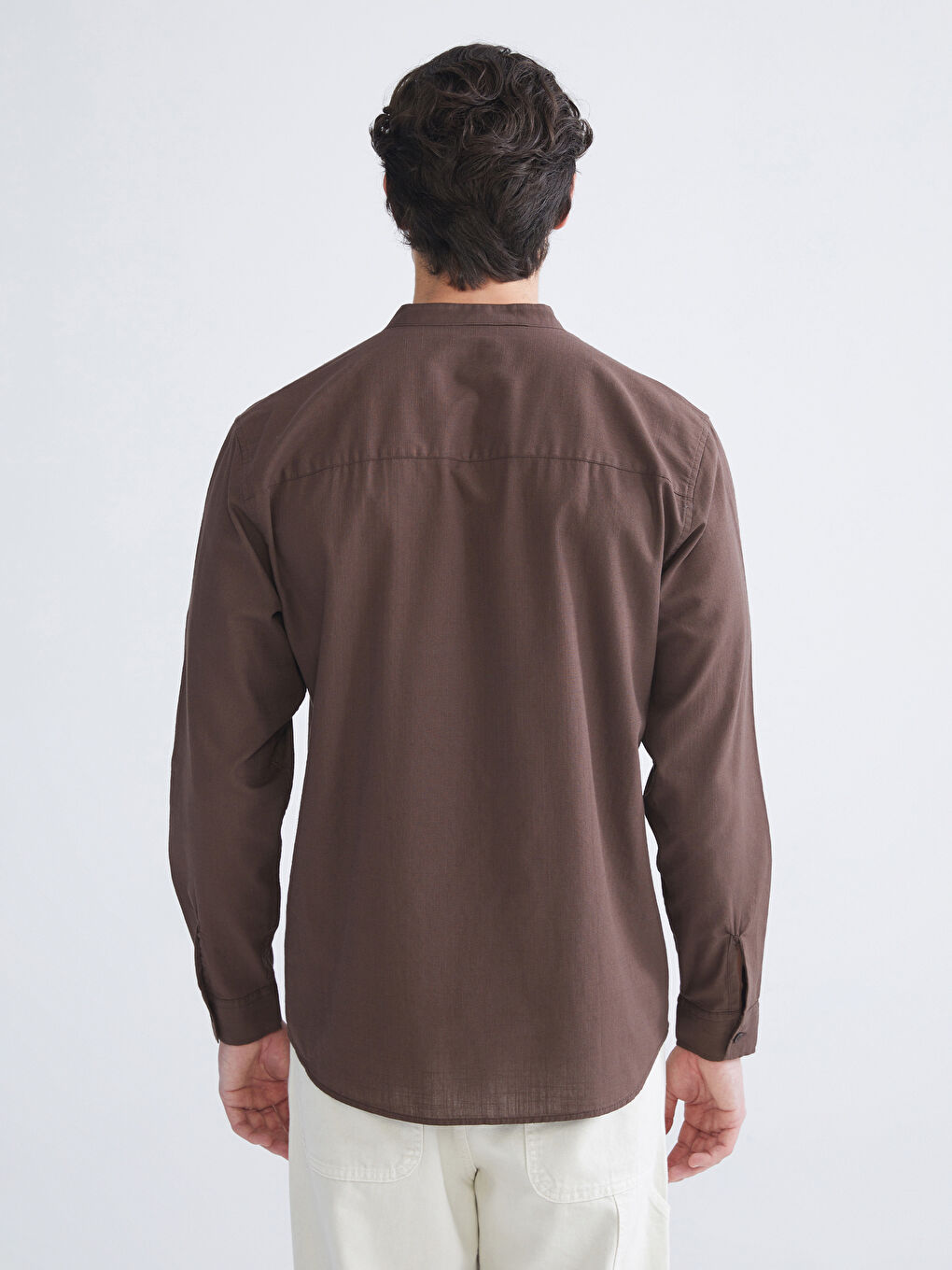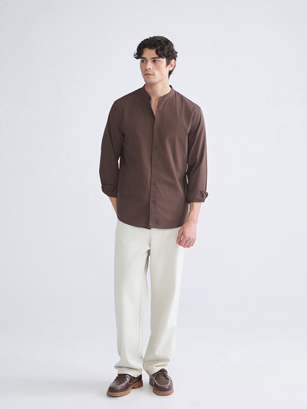 پیراهن مردانه پوپلین آستین بلند یقه ایستاده قهوهای معمولی