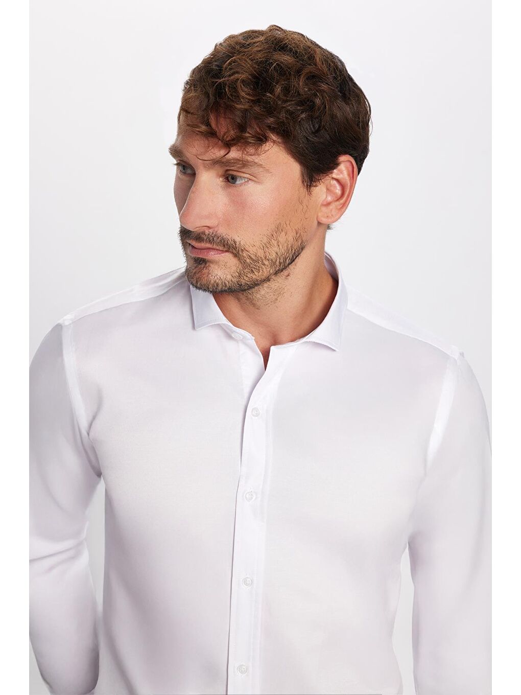 پیراهن مردانه سفید آستین بلند ساده ساتن نخی مدرن اسلیم فیت
