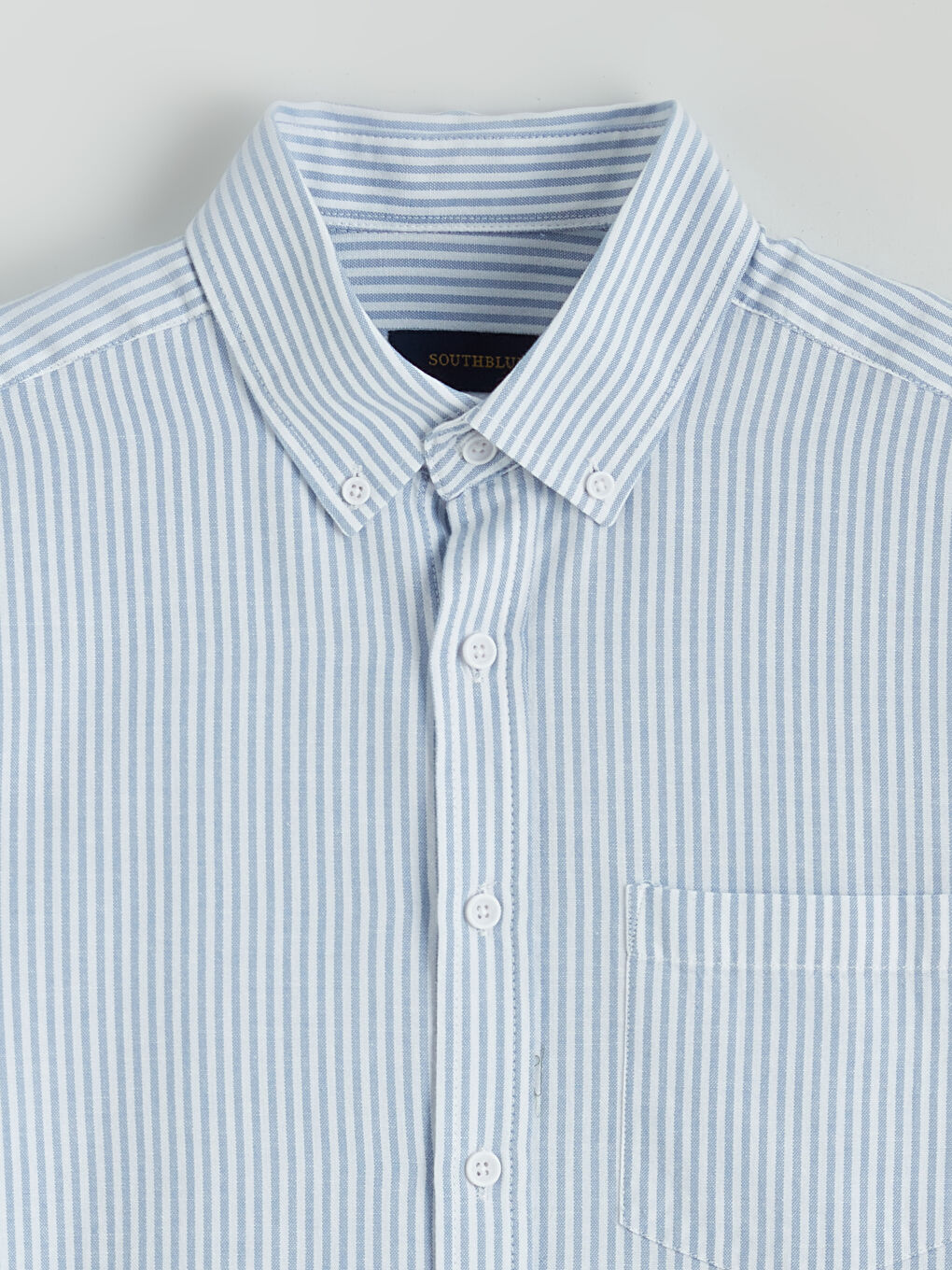 این پیراهن مردانه راه راه و یقه دکمهدار از پارچه آکسفورد ۱۰۰٪ پنبهای ساخته شده است. دارای آستینهای بلند، جیب روی سینه و دکمهدار در جلو است.