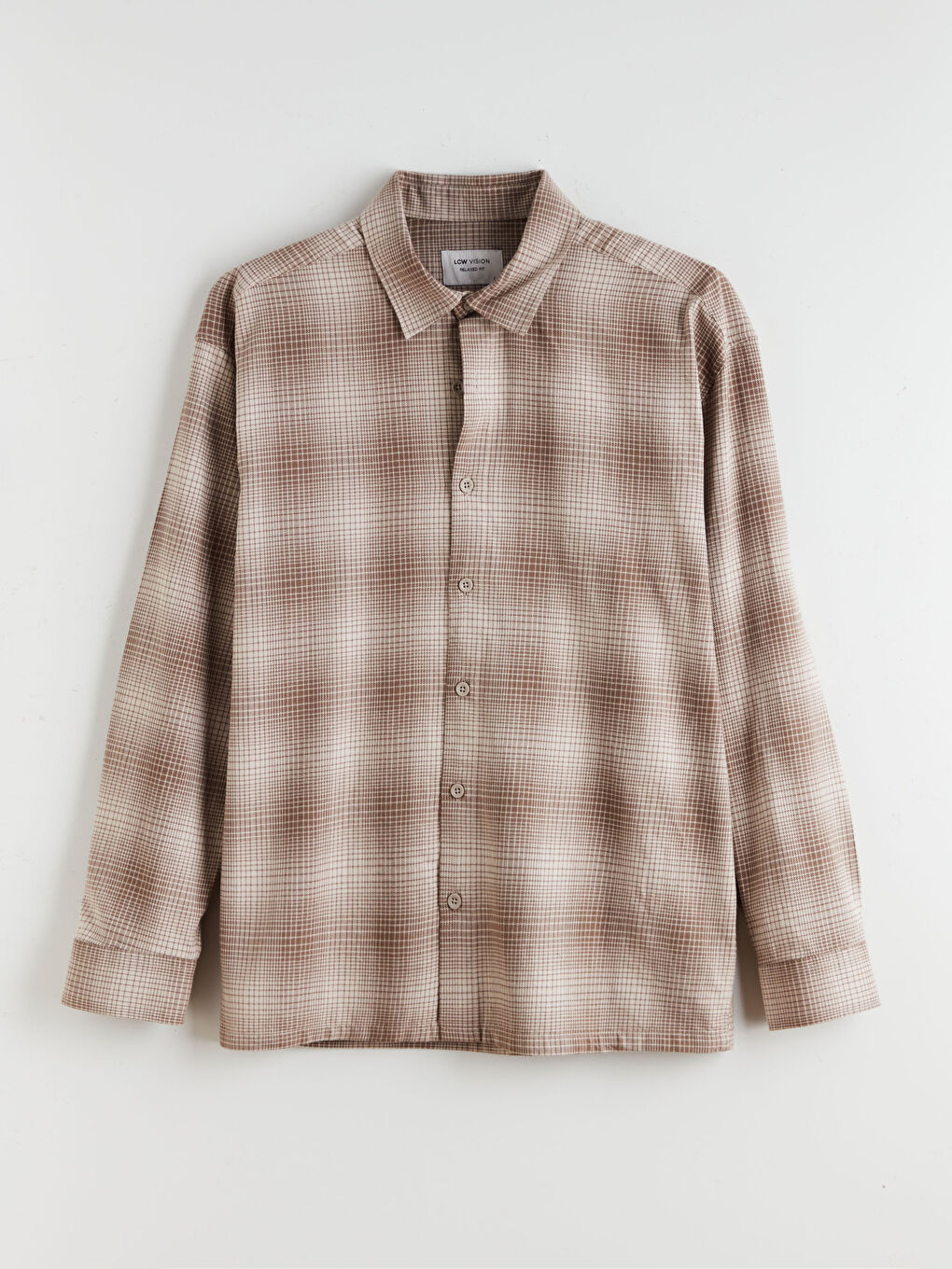 پیراهن مردانه آستین بلند شطرنجی منظم به رنگ بژ