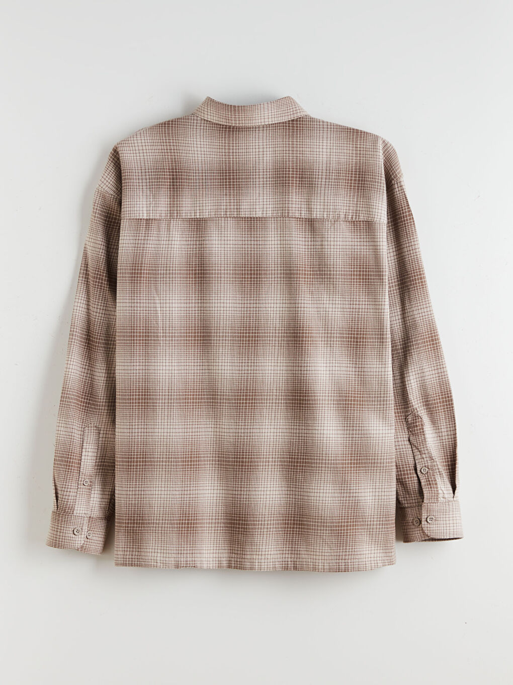 پیراهن چوب بری مردانه با برش منظم، طراحی آستین بلند و پارچه طرح دار چهارخانه.