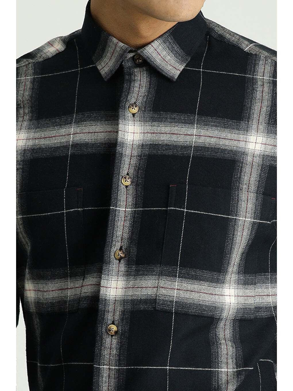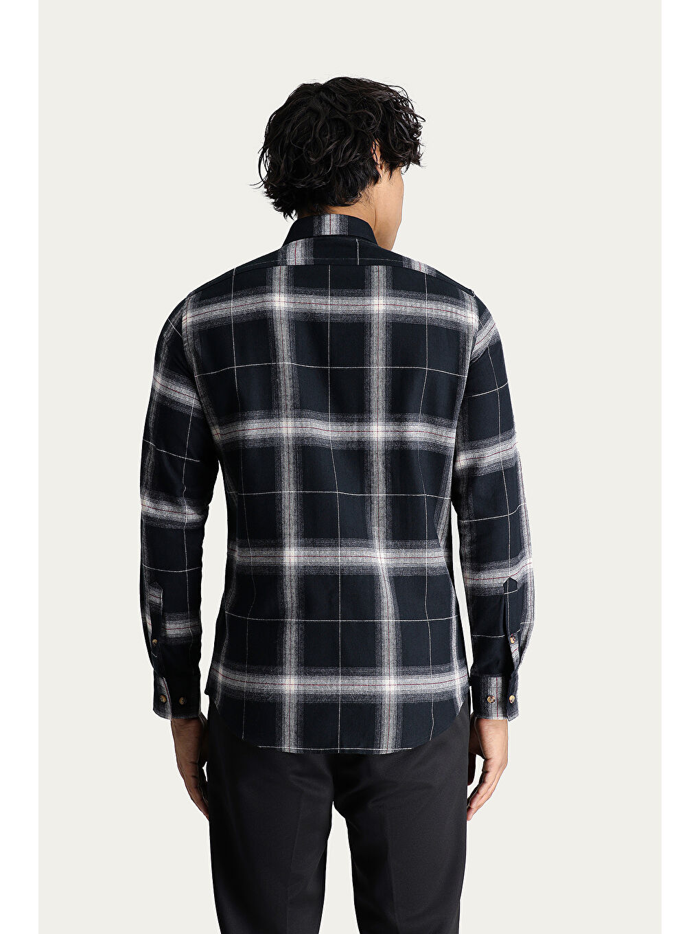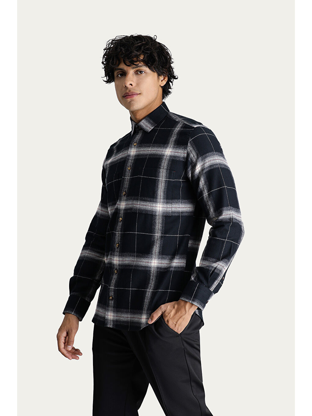 پیراهن نخی طرح چوب جنگلی، آستین بلند مشکی، اسلیم فیت، چهارخانه، فیت