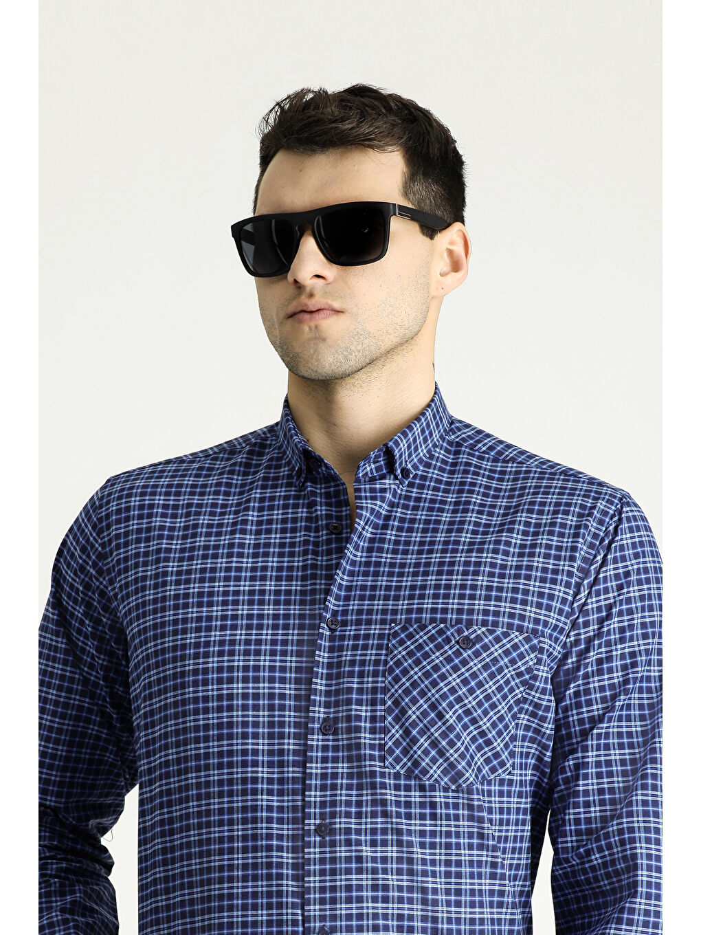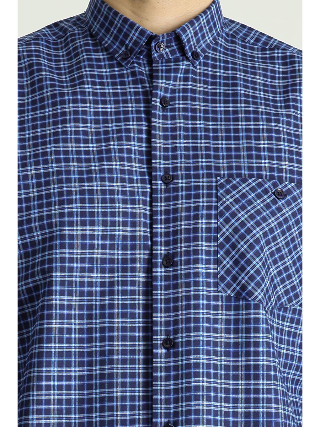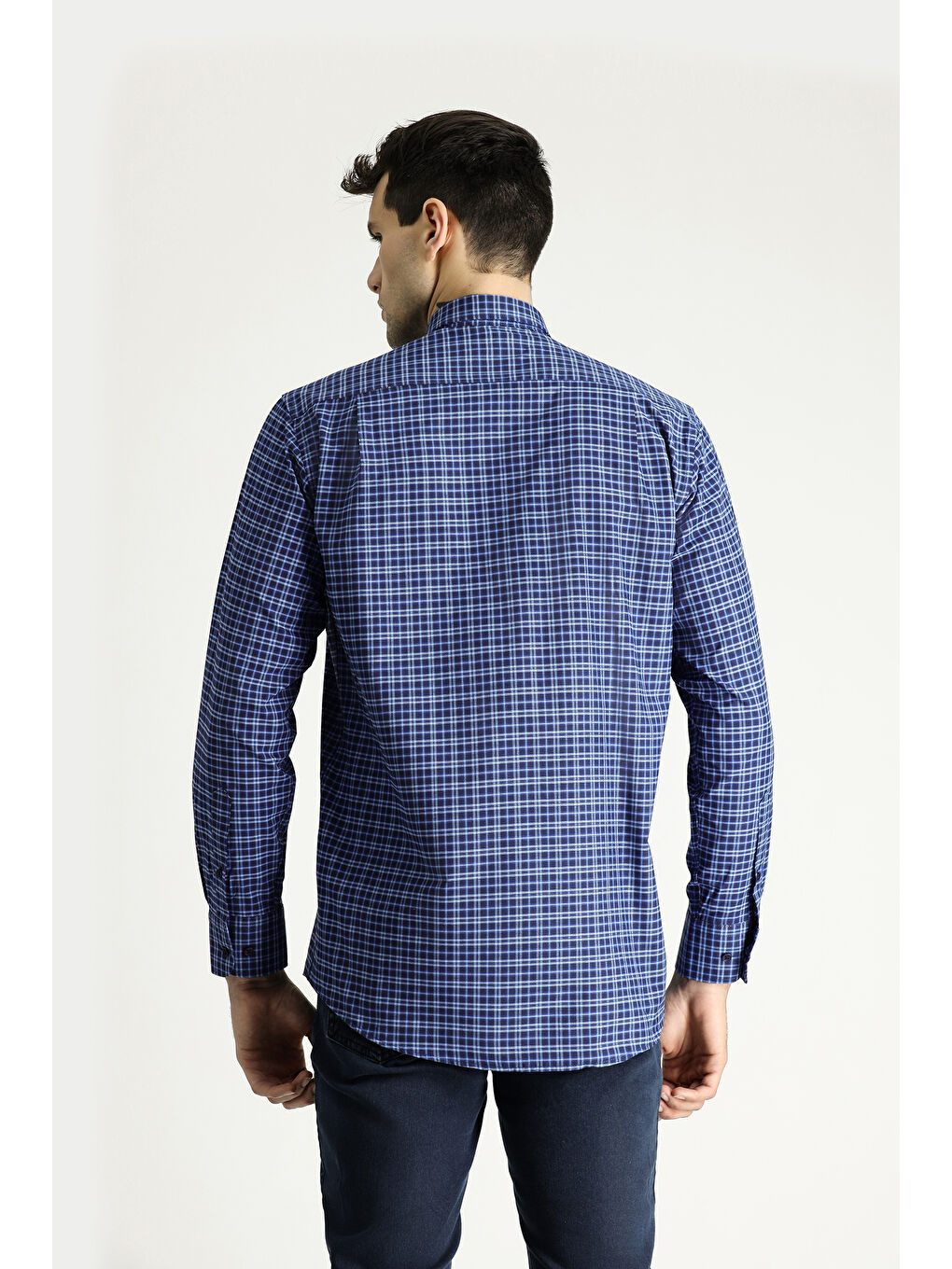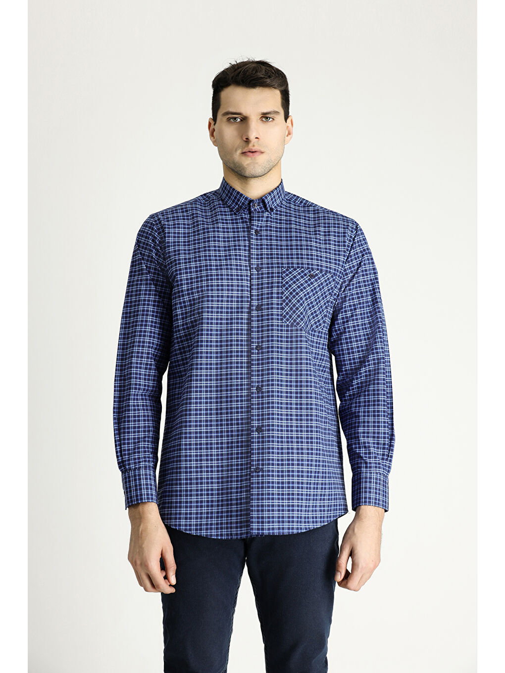پیراهن آستین بلند آبی طرحدار نخی یقه دکمهدار Easy Iron