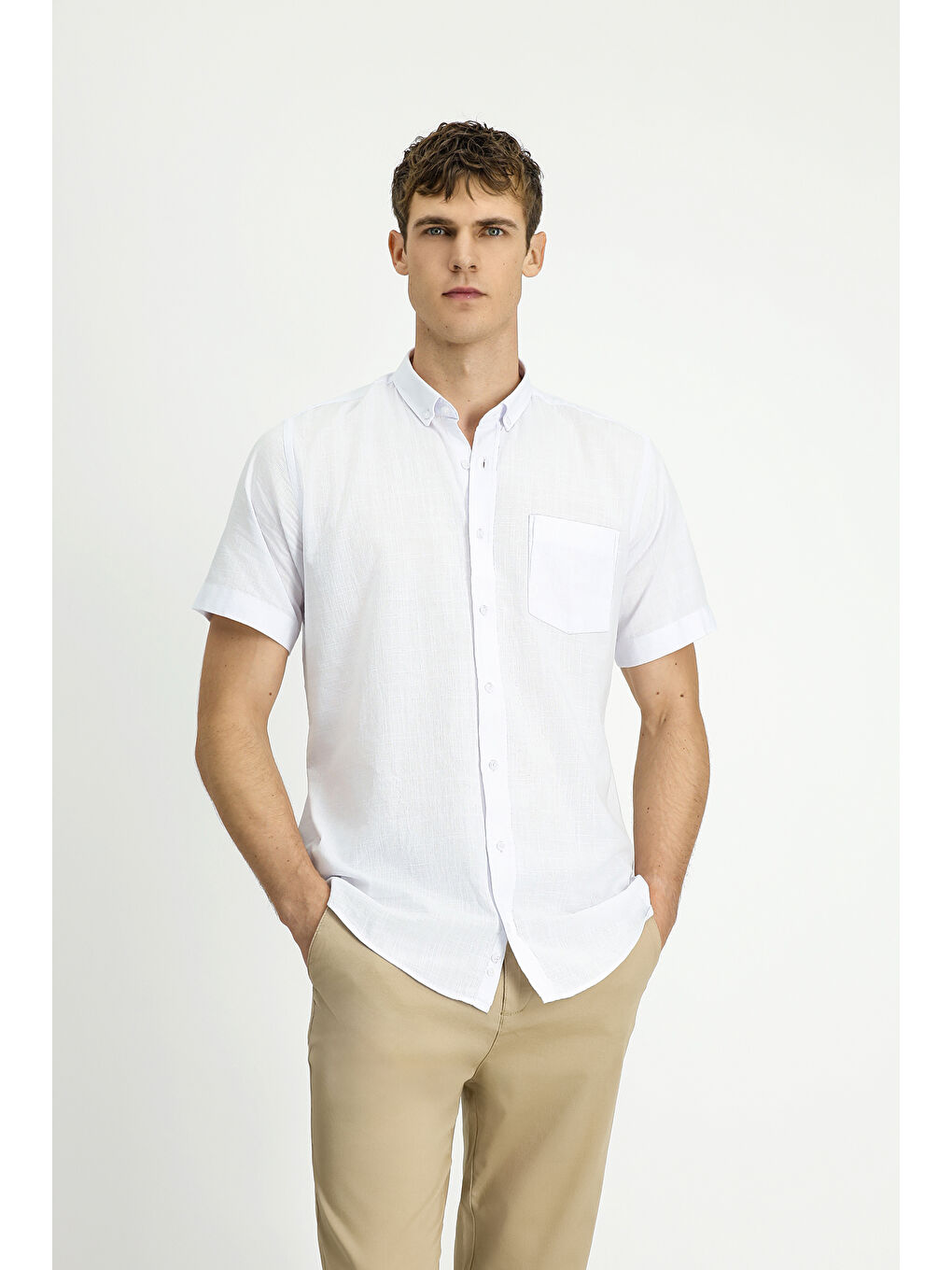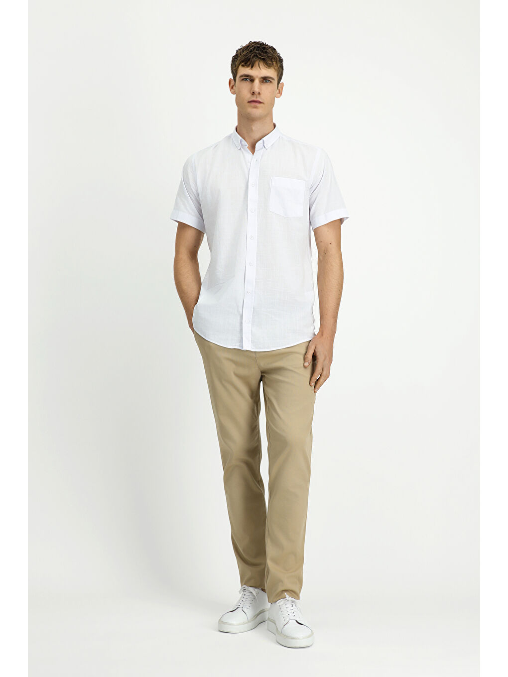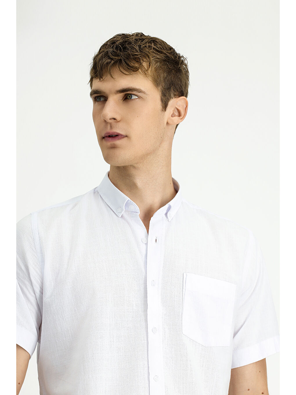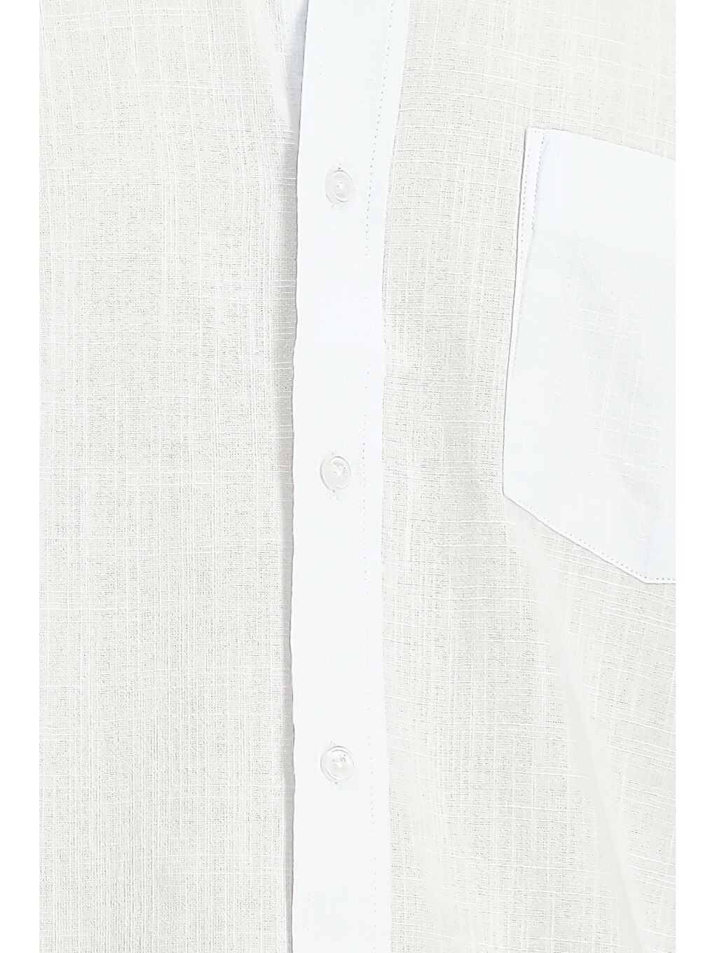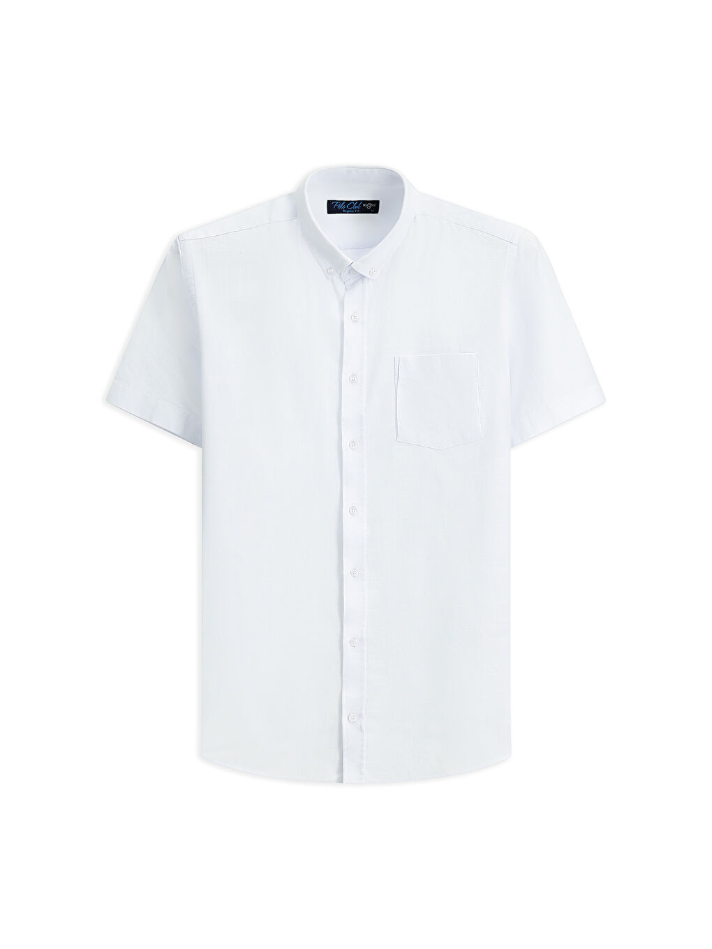 پیراهن ورزشی نخی سفید آستین کوتاه، یقه دکمهدار، طرح کتان