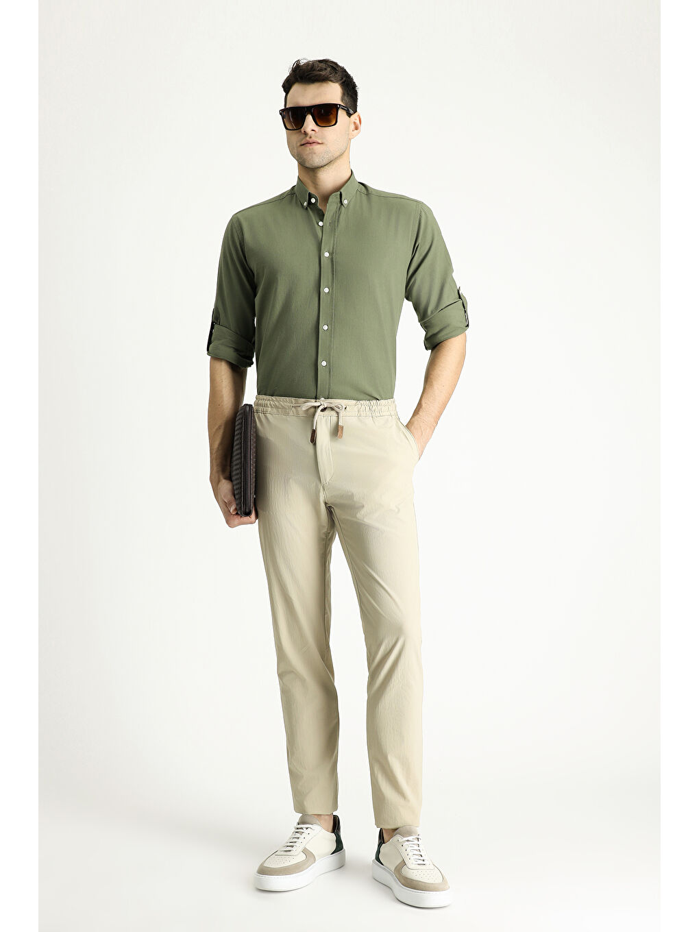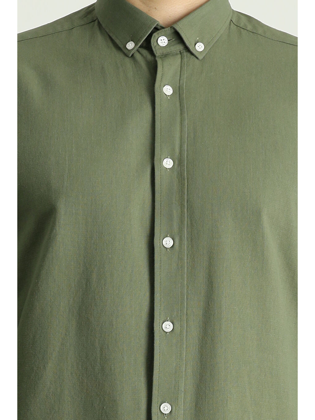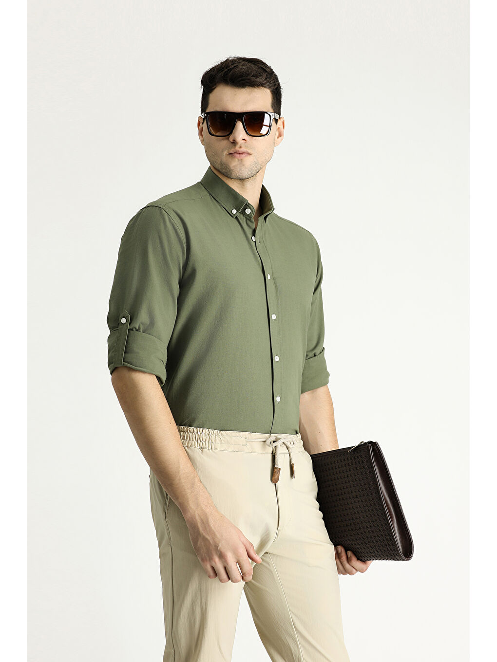 پیراهن نخی یقه دکمهدار، آستین بلند خاکی، راحت و مناسب برای استراحت، از جنس کتان